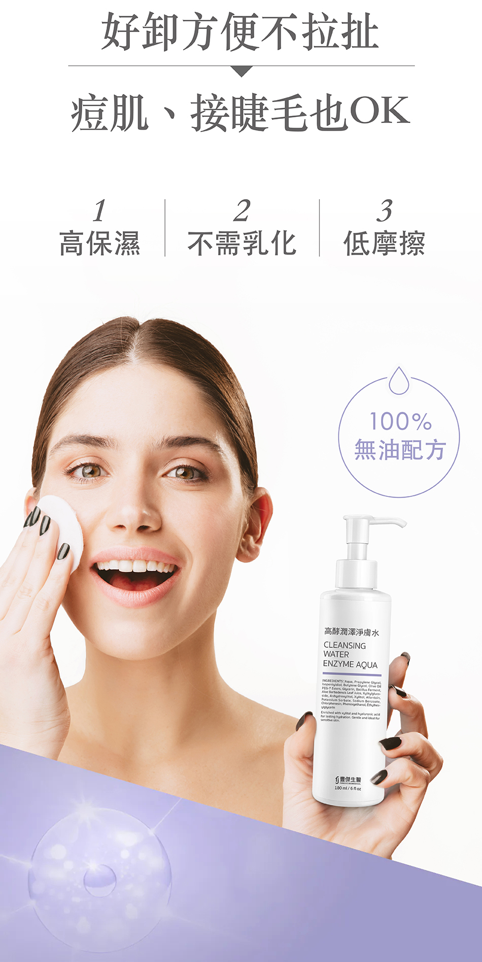 親水性極佳,沖水瞬間輕鬆帶走各種彩妝髒汙,溫和溶解、包覆髒污、殘妝,給肌膚最舒適的淨透感。