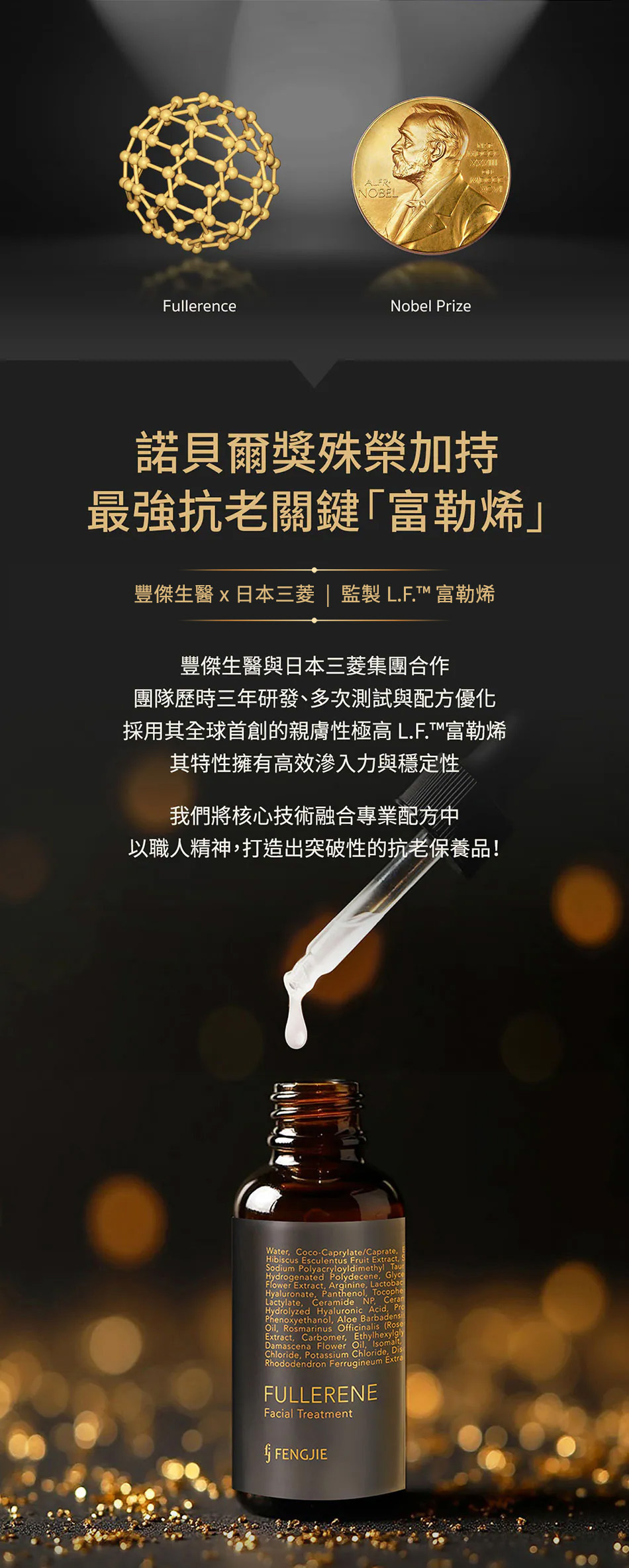 榮獲諾貝爾抗老原料富勒烯【市面最高濃度添加】,搭配獨家特殊培育玫瑰精華、雙倍高濃度水立方透明質酸精準深入肌底。