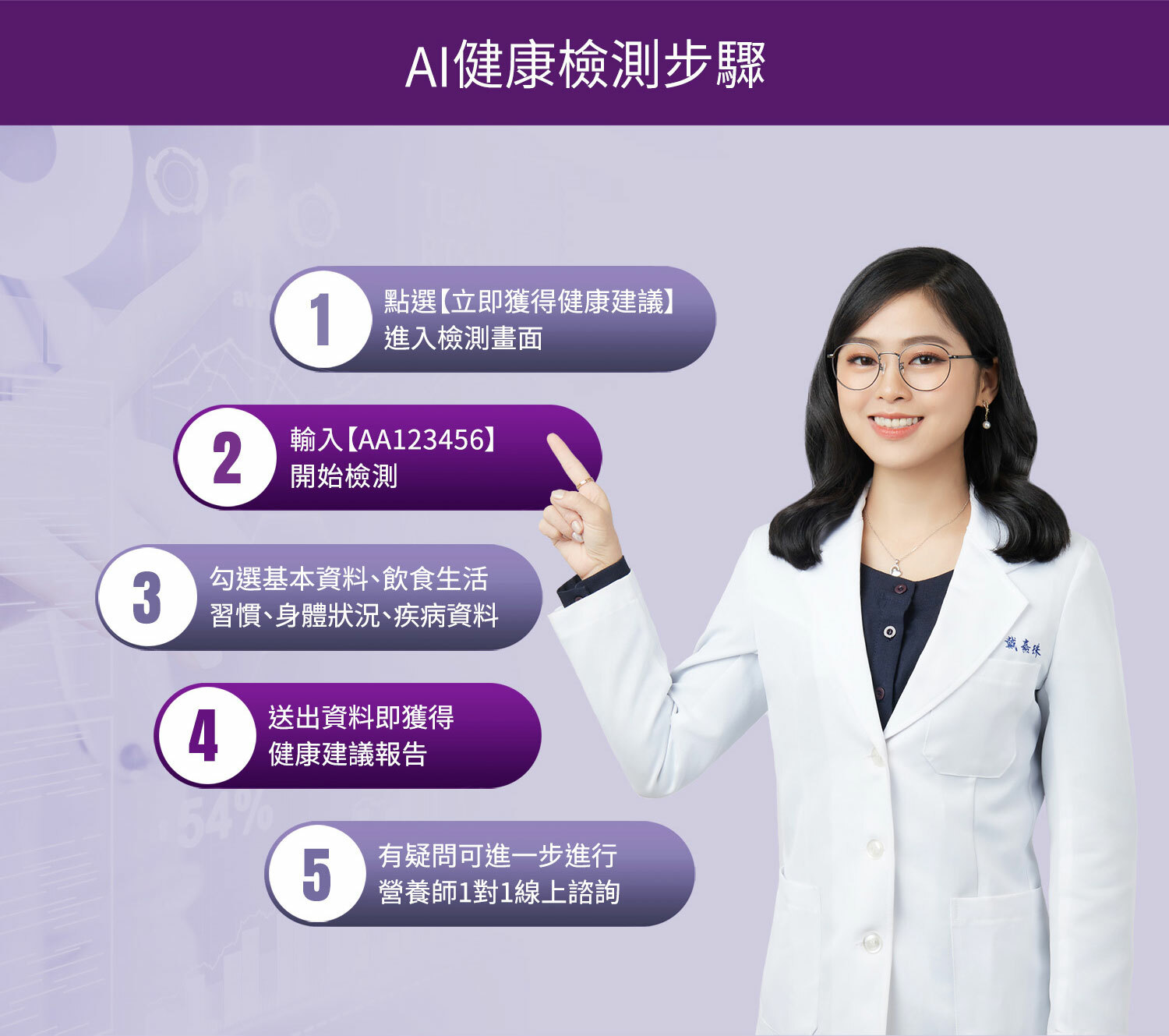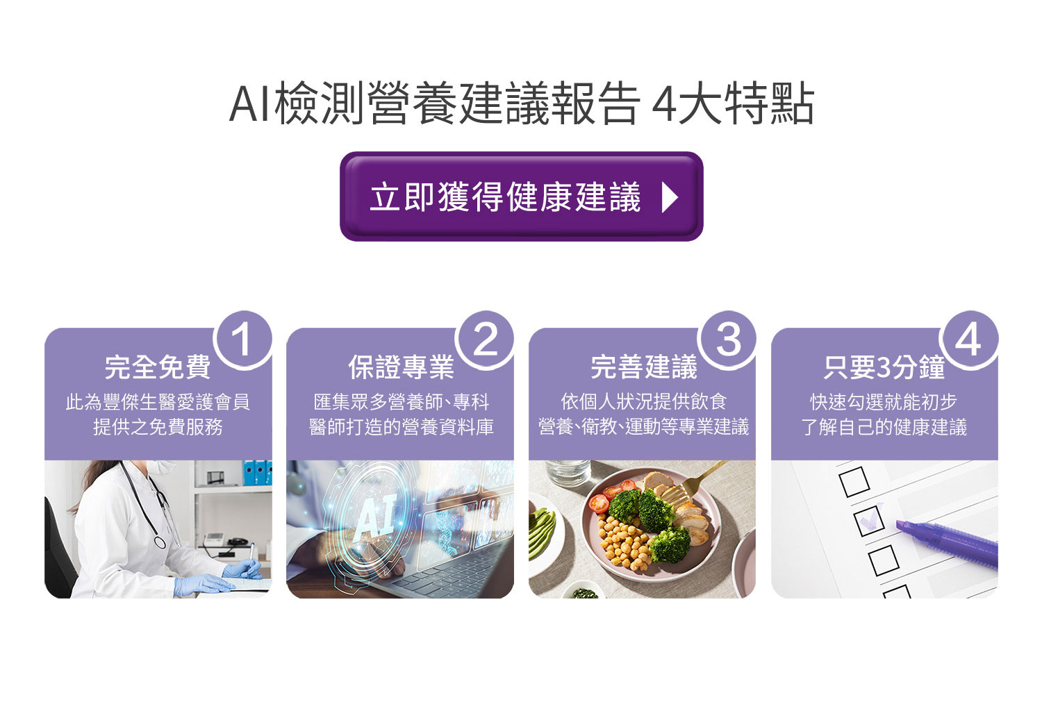 為提升民眾健康意識,豐傑生醫匯集營養師、醫師專業,免費提供AI營養檢測系統,讓大家更了解自己的健康狀況。無論是一般健康保養或有特殊疾病,都可藉由檢測獲得專屬飲食、營養、運動等建議,量身打造全方位健康生活策略。