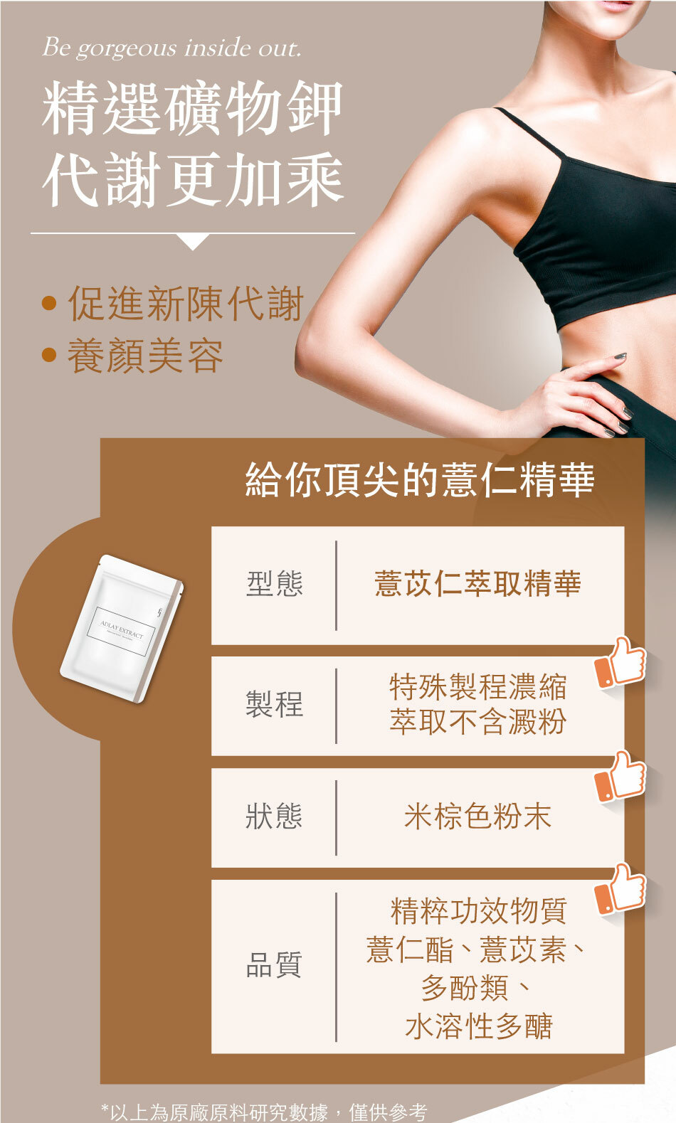 現代人飲食容易高鈉飲食以及水分補充不足,隔日就很容易看得出來狀態不佳。豐傑生醫的薏仁精華富含礦物質且特別添加代謝元素鉀,可以幫助促進新陳代謝。