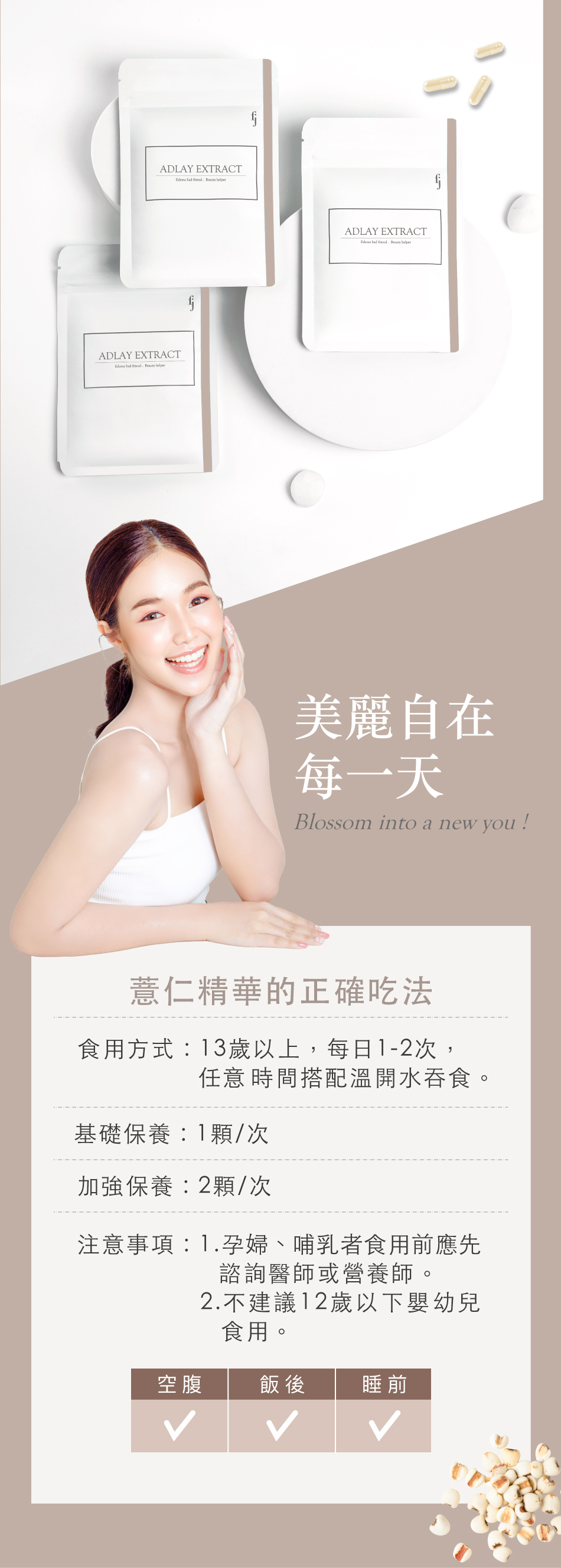 薏仁精華建議每日1-2次,每次1-2顆,任意時間搭配溫開水食用~