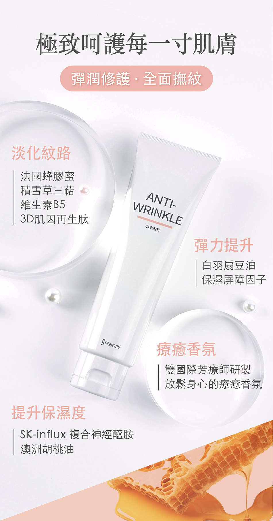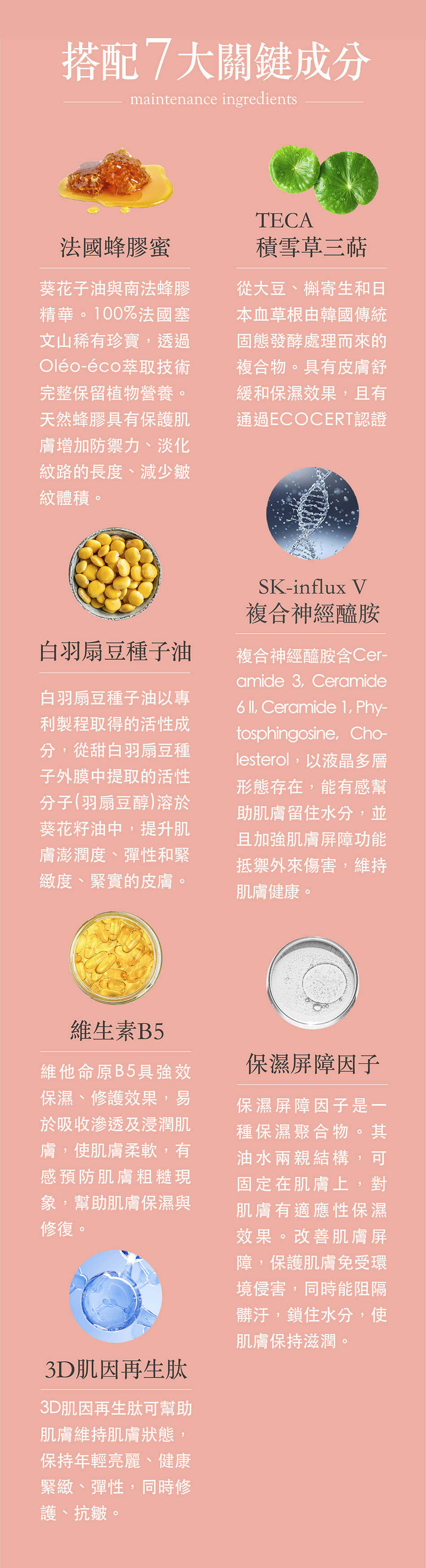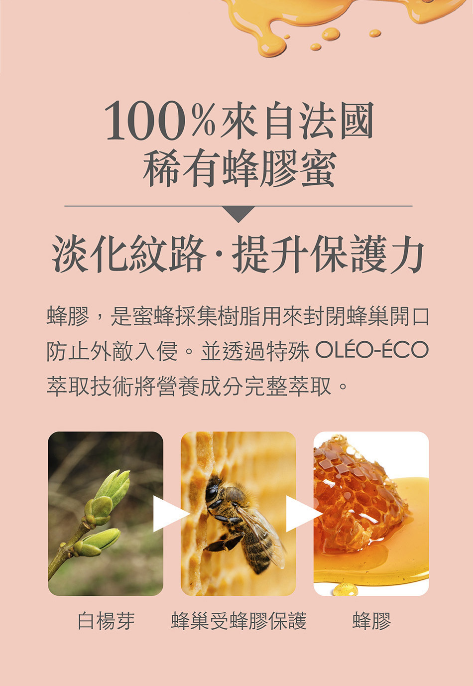 添加撫紋精華:100%法國蜂膠蜜/積雪草/白羽扇豆油/神經醯胺