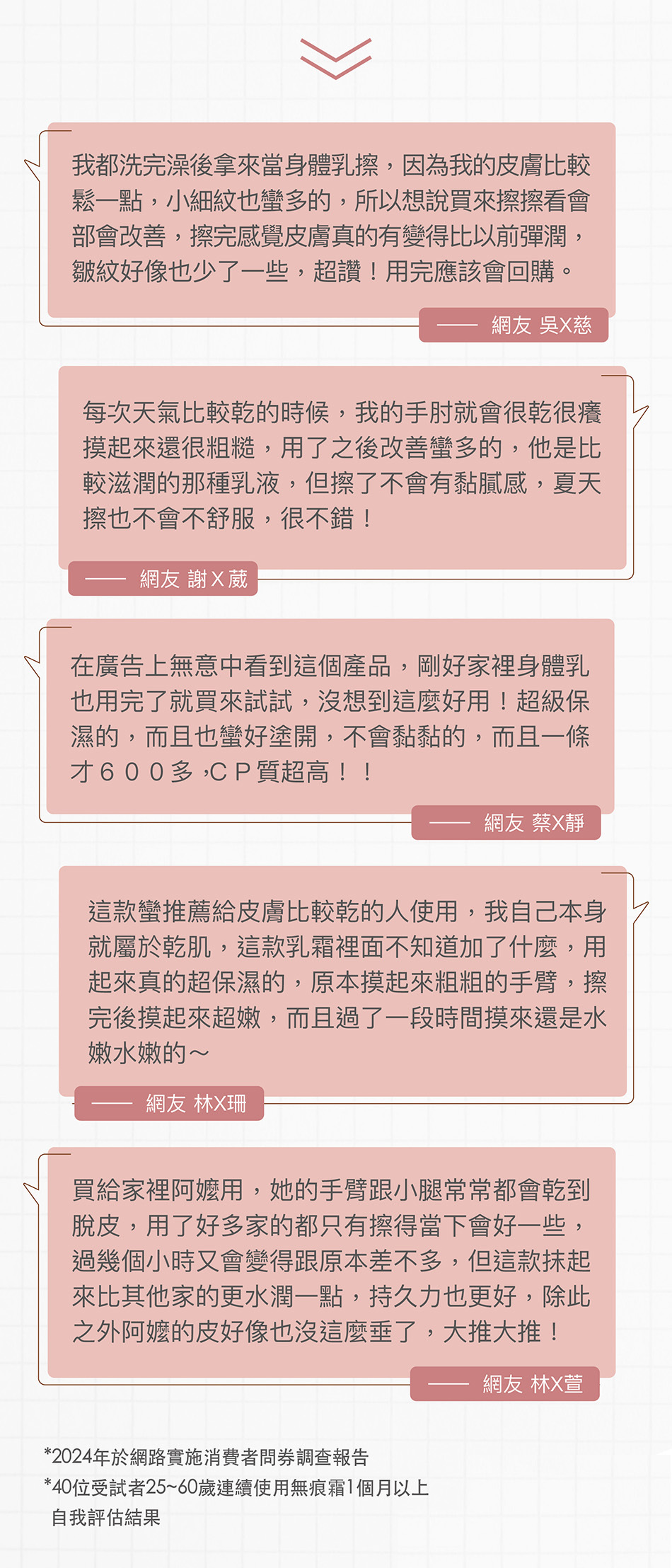 日常生活中衣服穿脫、頻繁的磨擦,都會讓手肘、膝蓋等關節處的肌膚容易乾燥、產生暗沉,摸起來甚至會有乾燥粗糙的觸感。除了這些角質比較厚的部位,頸後及屁股也很容易因為摩擦等因素產生暗沉、細紋。推薦使用具有保濕鎖水的撫紋霜去加強保養。