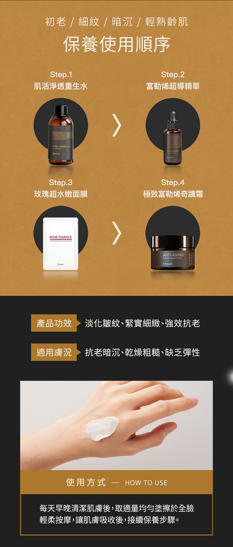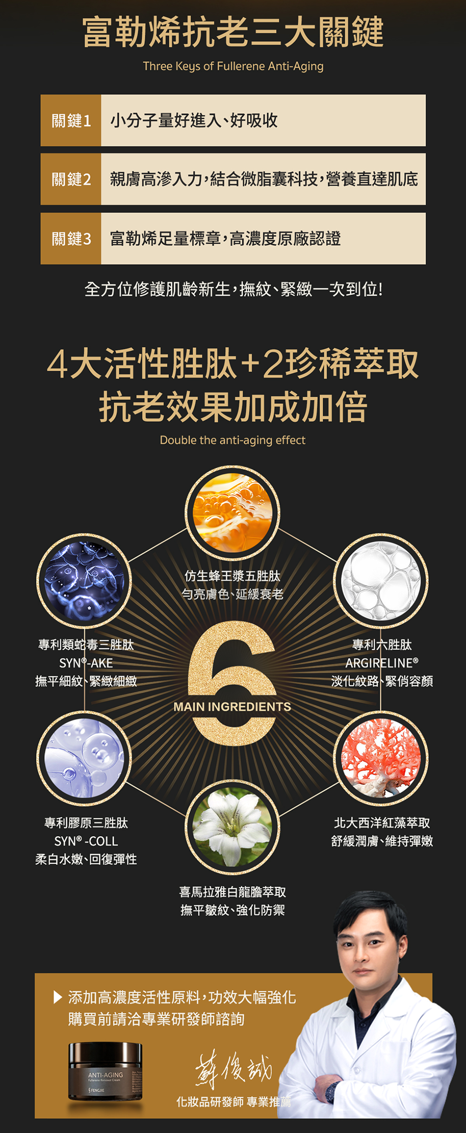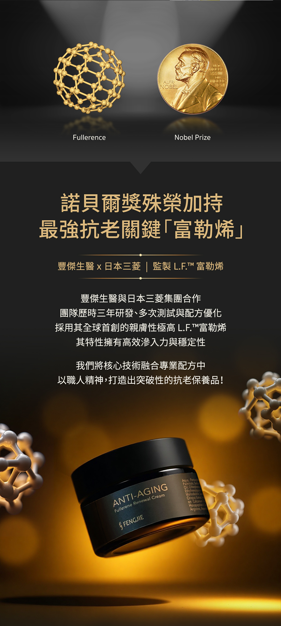 榮獲諾貝爾抗老原料富勒烯【市面最高濃度添加】,特殊碳60結構幫助三重抗老成分快速滲透入肌膚,精準長效清除殘留的老化因子