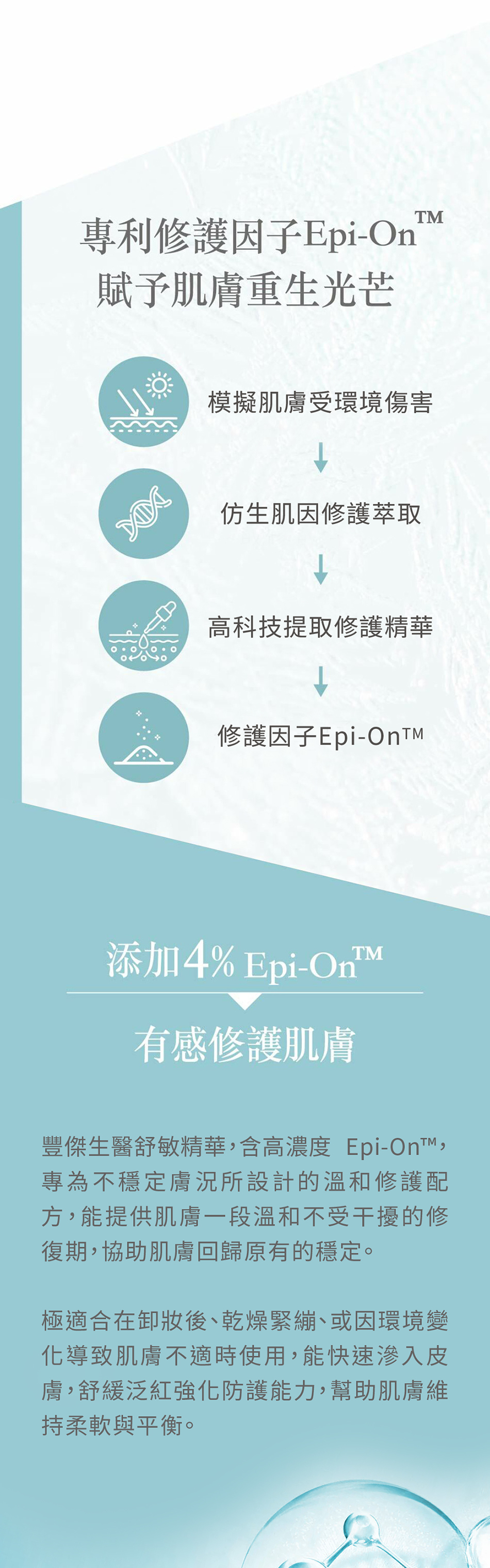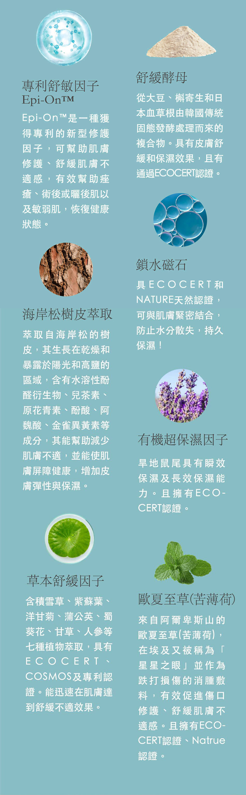 並含Epi-On TM、酵母、玻尿酸、鎖水磁石、松樹皮等多種修護成分,迅速恢復健康狀態、持久保濕。