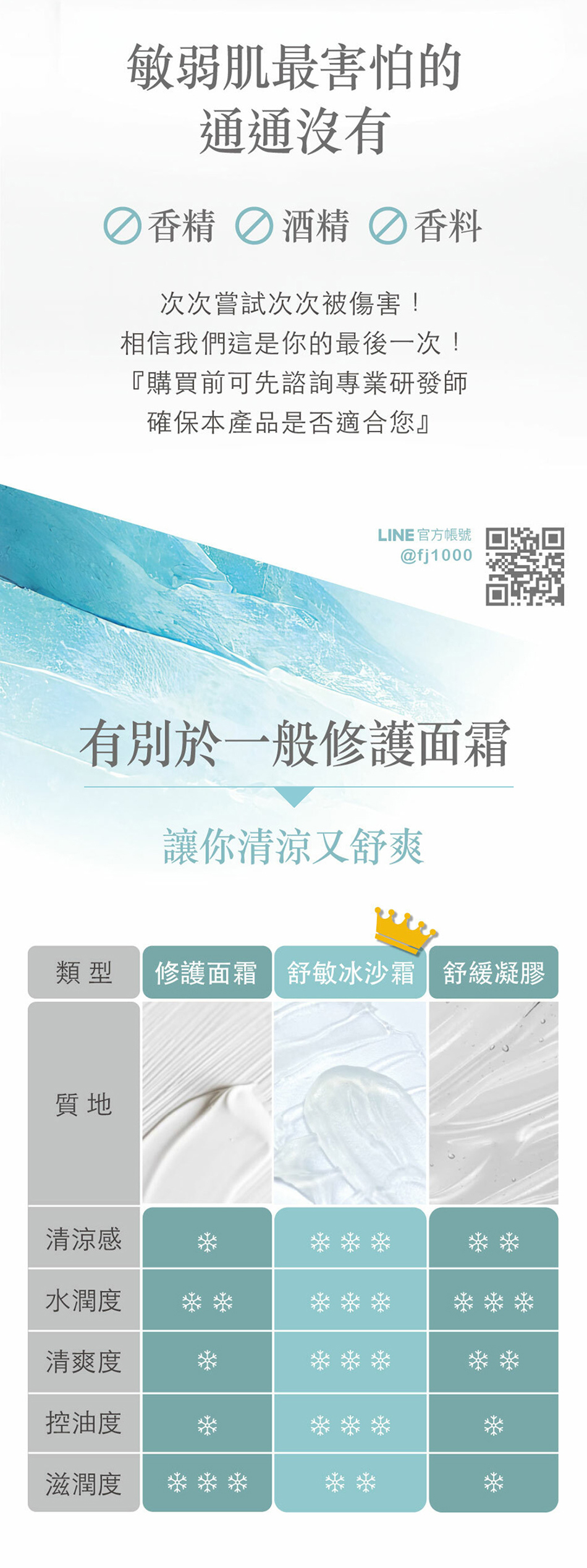豐傑的冰沙霜專門針對這兩種肌膚而設計,成分單純不添加色素、酒精、香精,