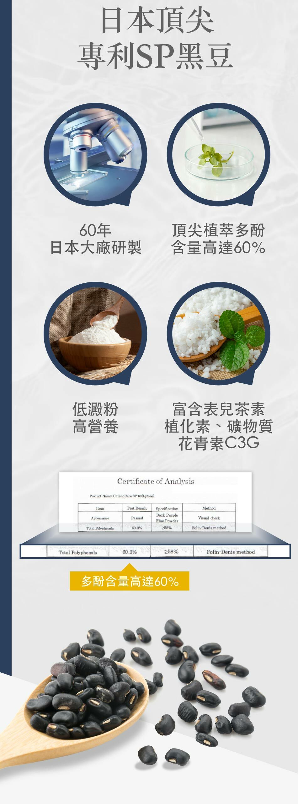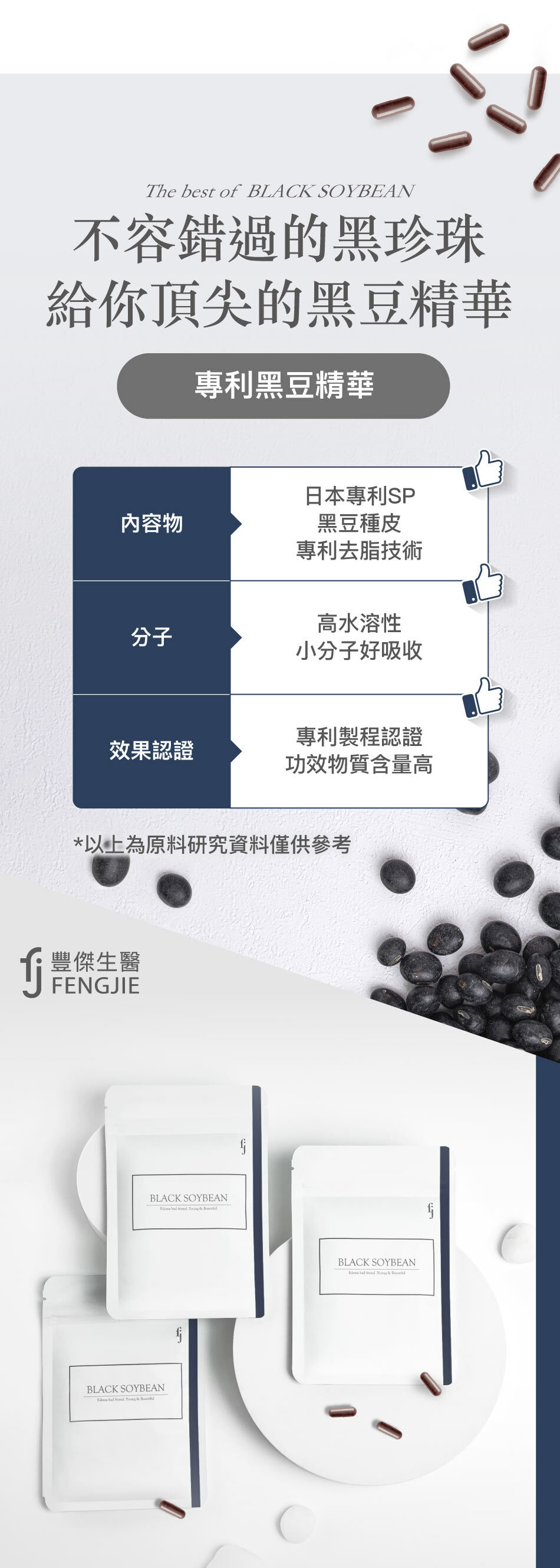 為什麼豐傑生醫採用黑豆種皮濃縮?是因為黑豆皮中含有豐富的多酚、礦物質、植化素、表兒茶素、花青素C3G等,而黑豆磨粉多是澱粉、蛋白質,因此選擇黑豆種皮濃縮對於促進新陳代謝來說更為適合!