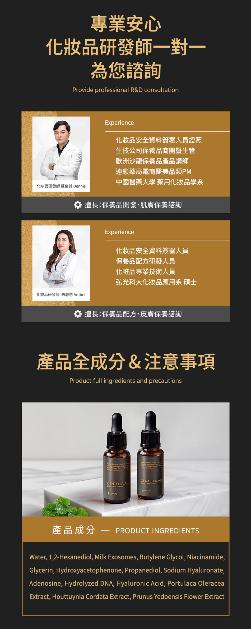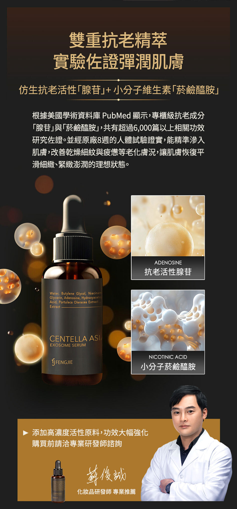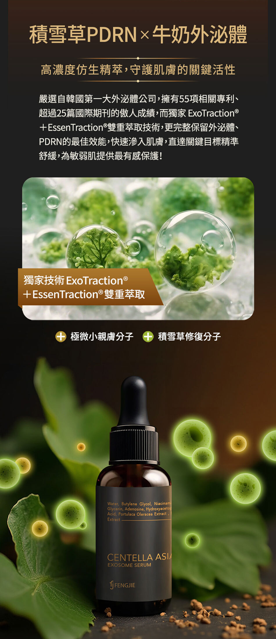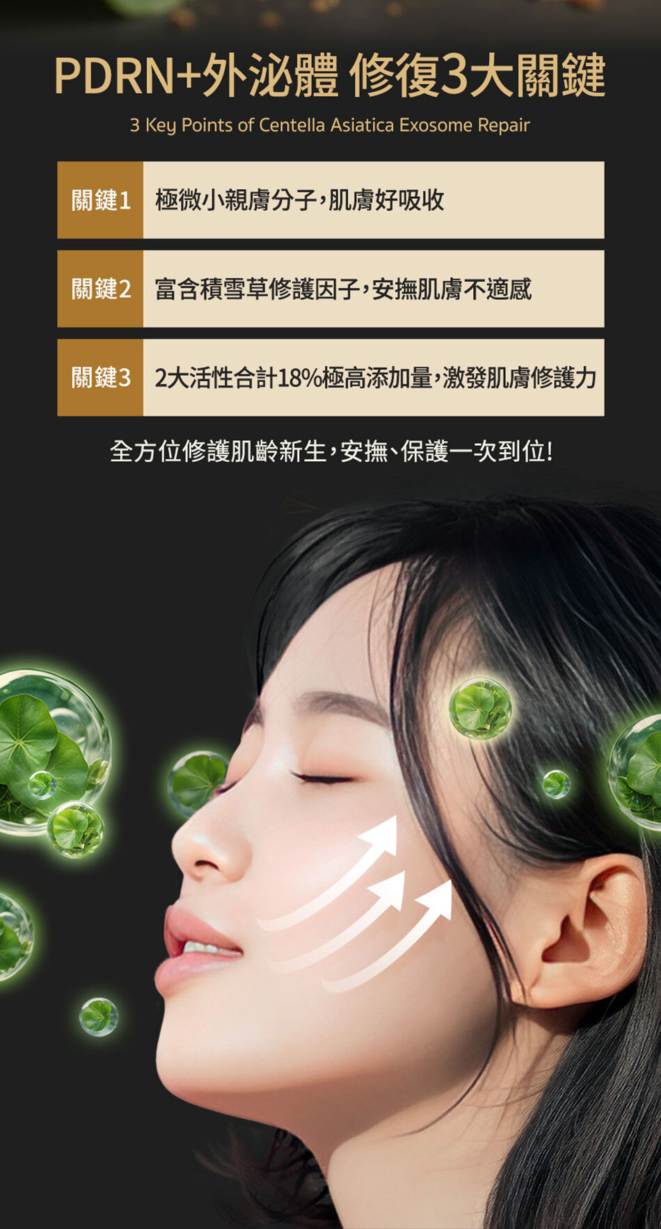 添加高濃度[積雪草PDRN]+[牛奶外泌體],源自自韓國第一大外泌體公司,擁有55項相關專利、超過25篇國際期刊的傲人成績,搭配仿生抗老活性「腺苷」+ 小分子維生素「菸鹼醯胺」,將修護、抗老活性,濃縮蘊含在每滴原液中。