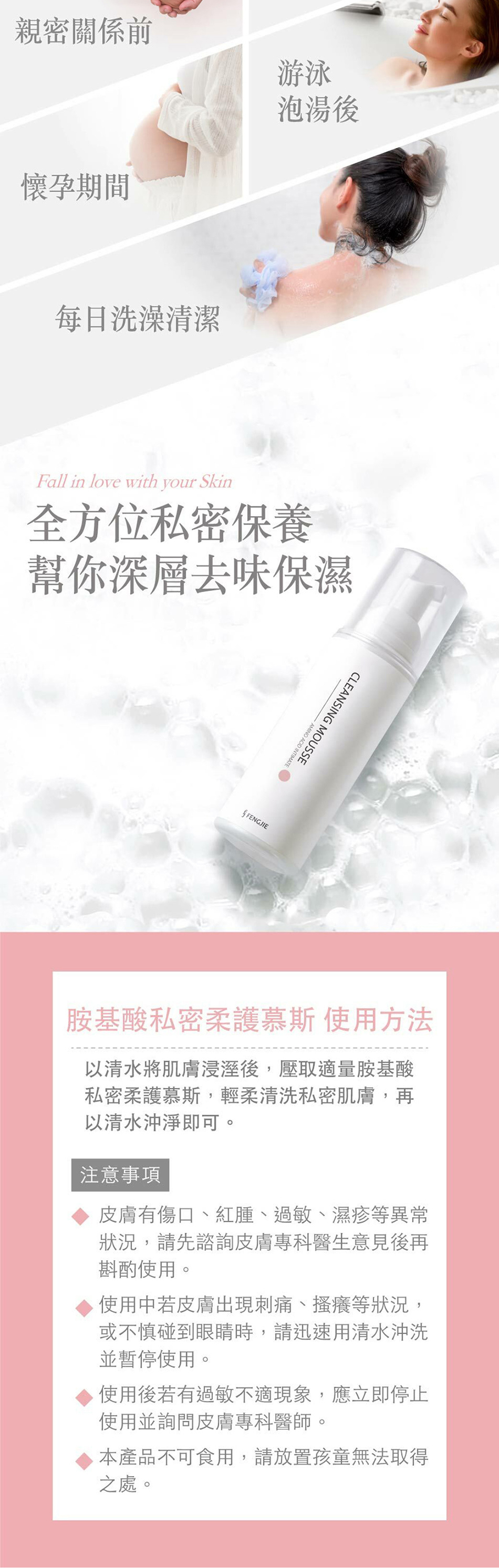 以清水將肌膚浸溼後,壓取適量胺基酸私密柔護慕斯,輕柔清洗私密肌膚,再以清水沖淨即可。