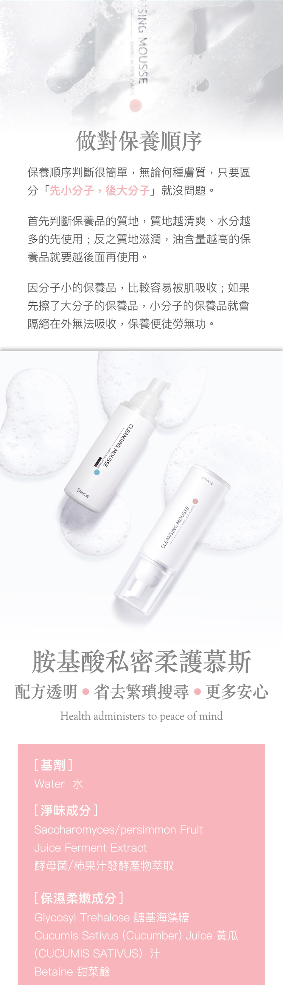 使用胺基酸私密柔護慕斯 可以幫助溫和去除私密肌膚的髒污、汗水、調理肌膚,進而幫助肌膚更加光滑柔嫩,pH5.5洗後保濕溫和舒適是您很好的選擇!