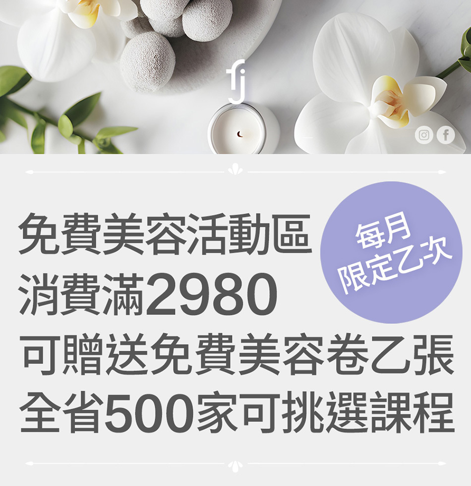 ※符合沙龍活動:消費滿$2980,免費兌換美容乙次此優惠活動,當月限兌換乙次 (每帳號),隔月1日始可再次購買兌換,以此類推