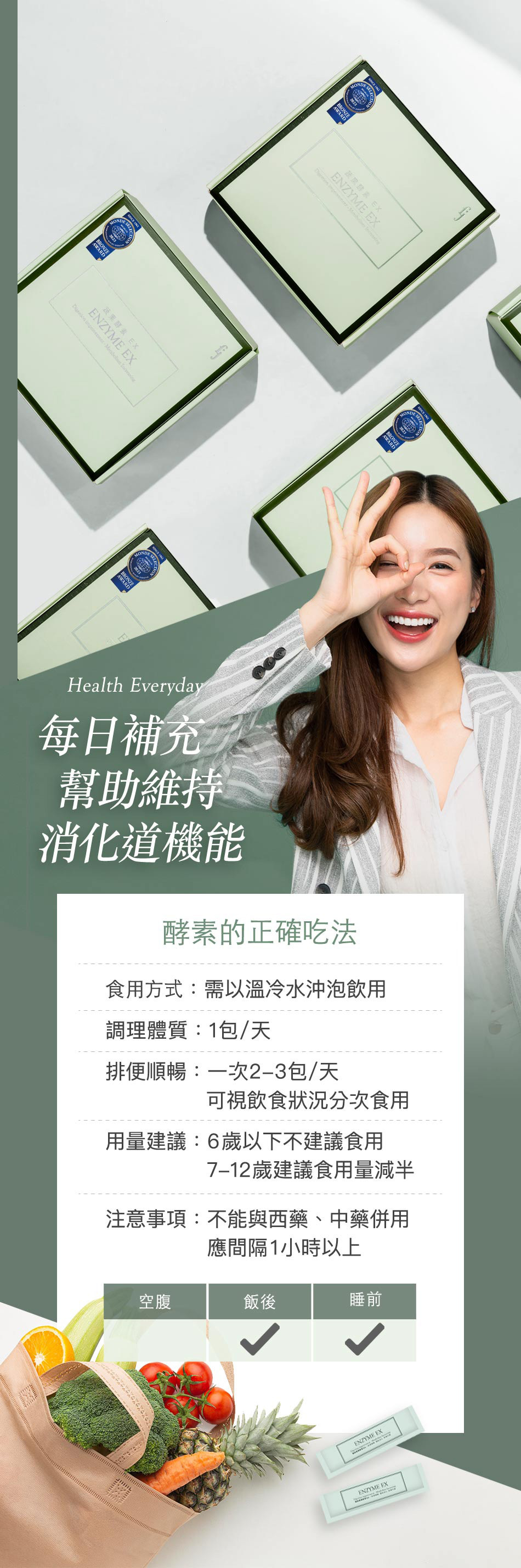 可以自由搭配一天中的最後一餐,如果斷食24小時,可以等開始進食後再搭配酵素喔!