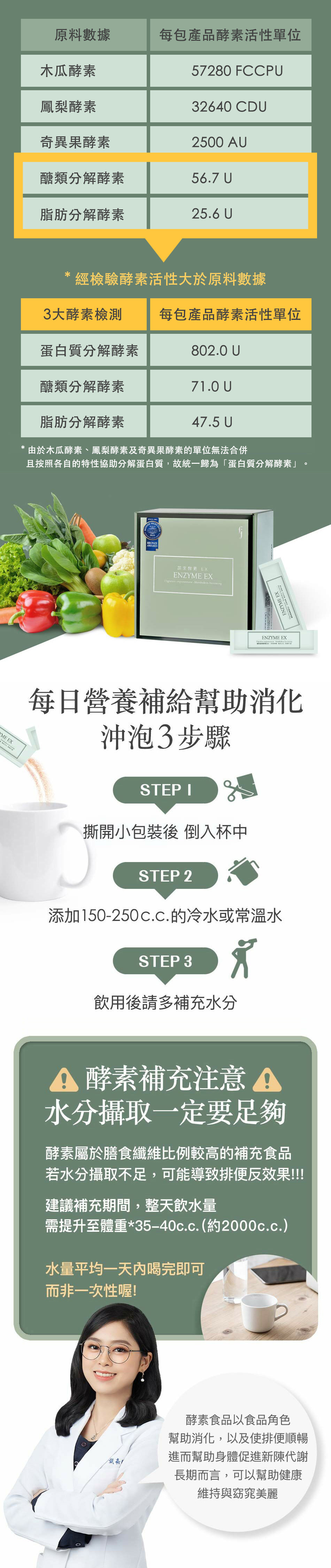 在過去兩年間,我們不斷優化舊版酵素配方,除了提升蔬果的豐富度,還增加了膳食纖維含量,達成了黃金比例的雙效膳食纖維配方。為了提供顧客更大的安心保障,進行了酵素活性與膳食纖維含量檢測。結果顯示,酵素活性不僅高於原料數據,每包酵素更含有「高達33%的膳食纖維」,促進腸道蠕動、幫助排便順暢。最重要的是,我們的蔬果酵素EX不含任何瀉藥成分,不同於市面上許多含有瀉藥成分的酵素,讓你享受純淨的配方,食用更安心。此外,還特別委託專業機構,進行菌相實驗,並且通過SNQ國家品質標章認證,讓產品的有感度與安心度更加卓越。