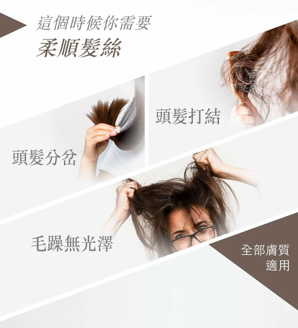 依個人頭髮狀態需要,建議可每天「洗髮+潤髮」的方式來保養。若是頭髮受損或需要深層保養時,建議厚塗再以浴帽包裹靜置15分鐘之後洗去,即可達到深層護理效果!