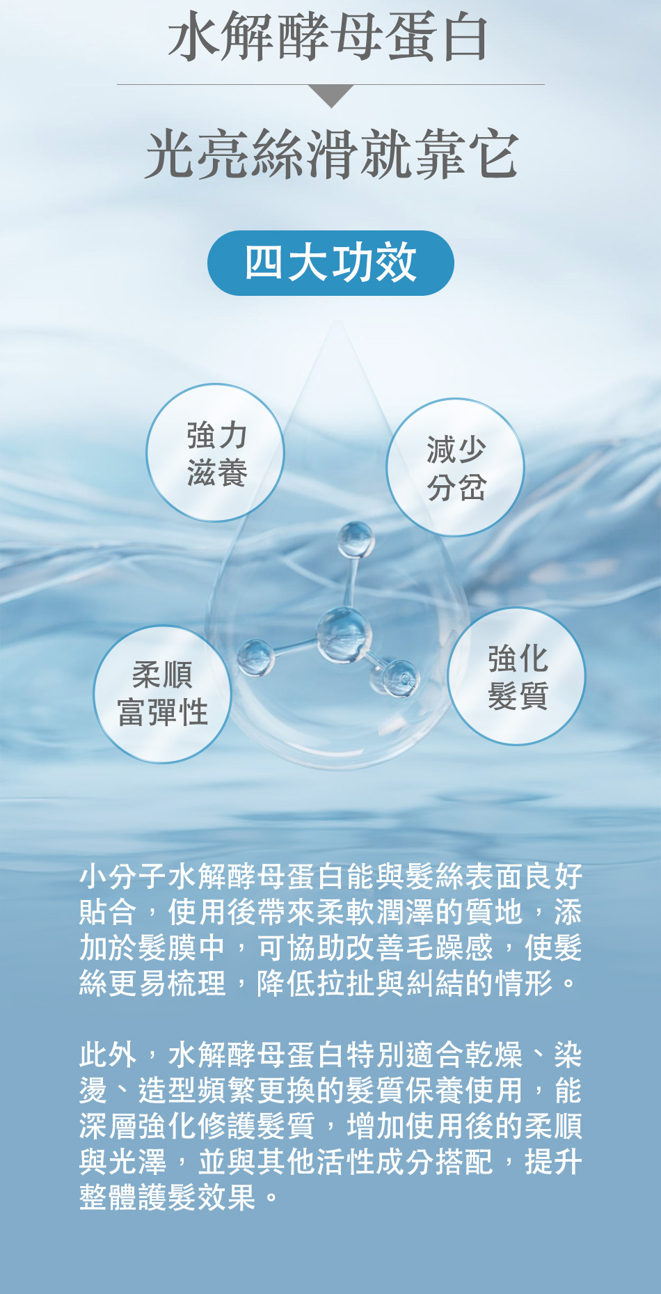 藜麥蛋白是多功能天然蛋白,可維持、調理和保護毛髮。對於受損、乾燥、染燙後的頭髮需要額外的滋潤修護,而天然的藜麥蛋白能幫助頭髮保留光澤,使髮絲更加有彈性、柔順。