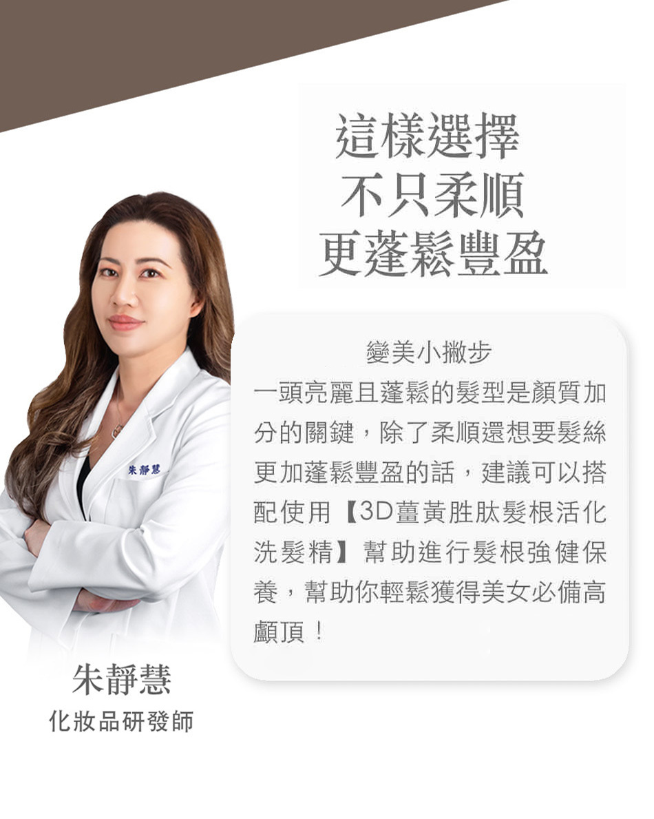 想要加強髮絲蓬鬆豐盈的話,建議可以搭配使用【3D薑黃胜肽髮根活化洗髮精】幫助進行深層保養,加倍強健滋養髮絲!