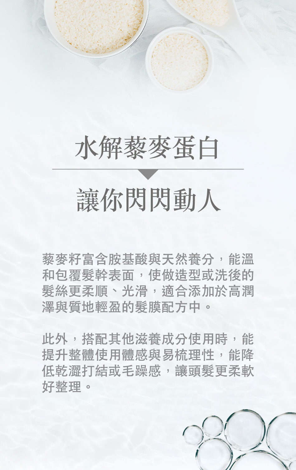 藜麥蛋白是多功能天然蛋白,可維持、調理和保護毛髮。對於受損、乾燥、染燙後的頭髮需要額外的滋潤修護,而天然的藜麥蛋白能幫助頭髮保留光澤,使髮絲更加有彈性、柔順。