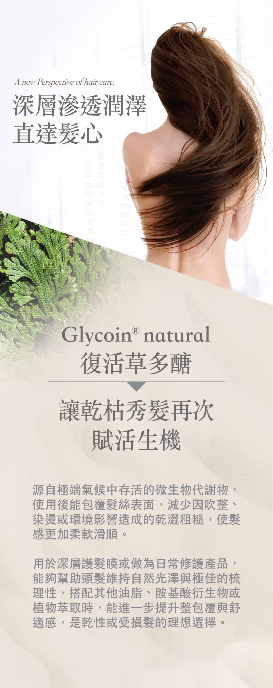 復活草多醣擁有優異的保水力,能使髮尾乾燥而分岔的頭髮進行修補、平順,髮尾不再毛躁亂翹。