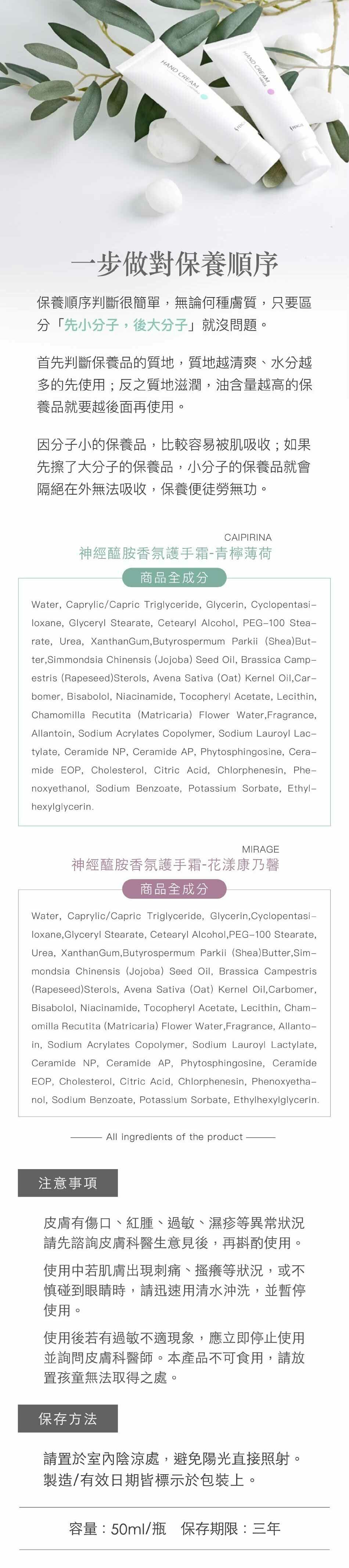 神經醯胺、乳木果油、芭芭荷油、燕麥油、沒藥醇、尿素、植物甾醇、洋甘菊蒸餾液等,添加多種高品質保濕鎖水成分。