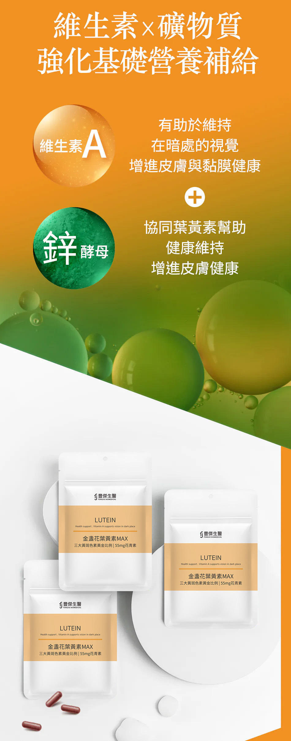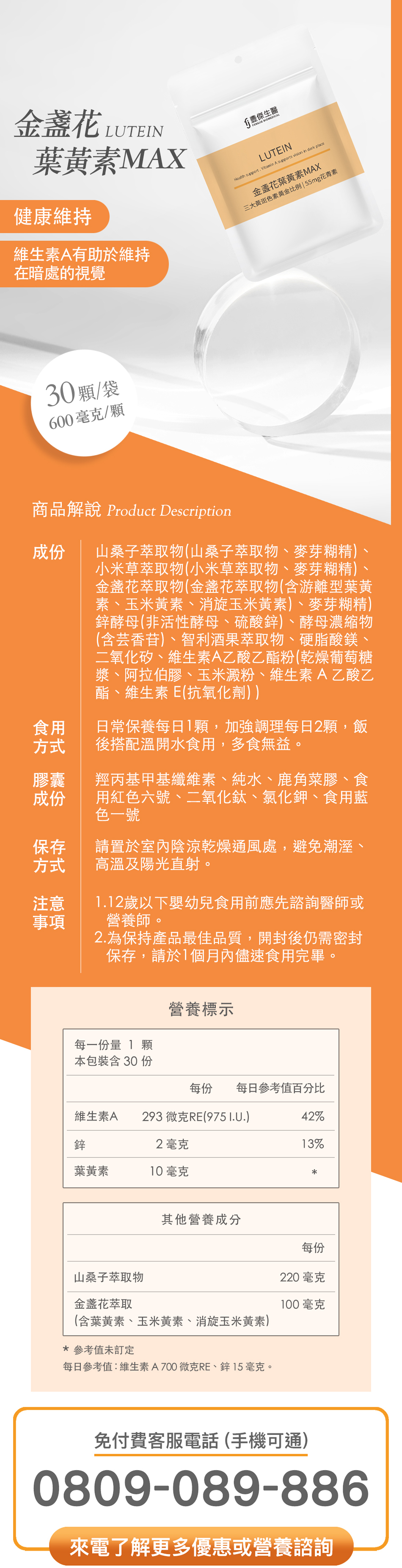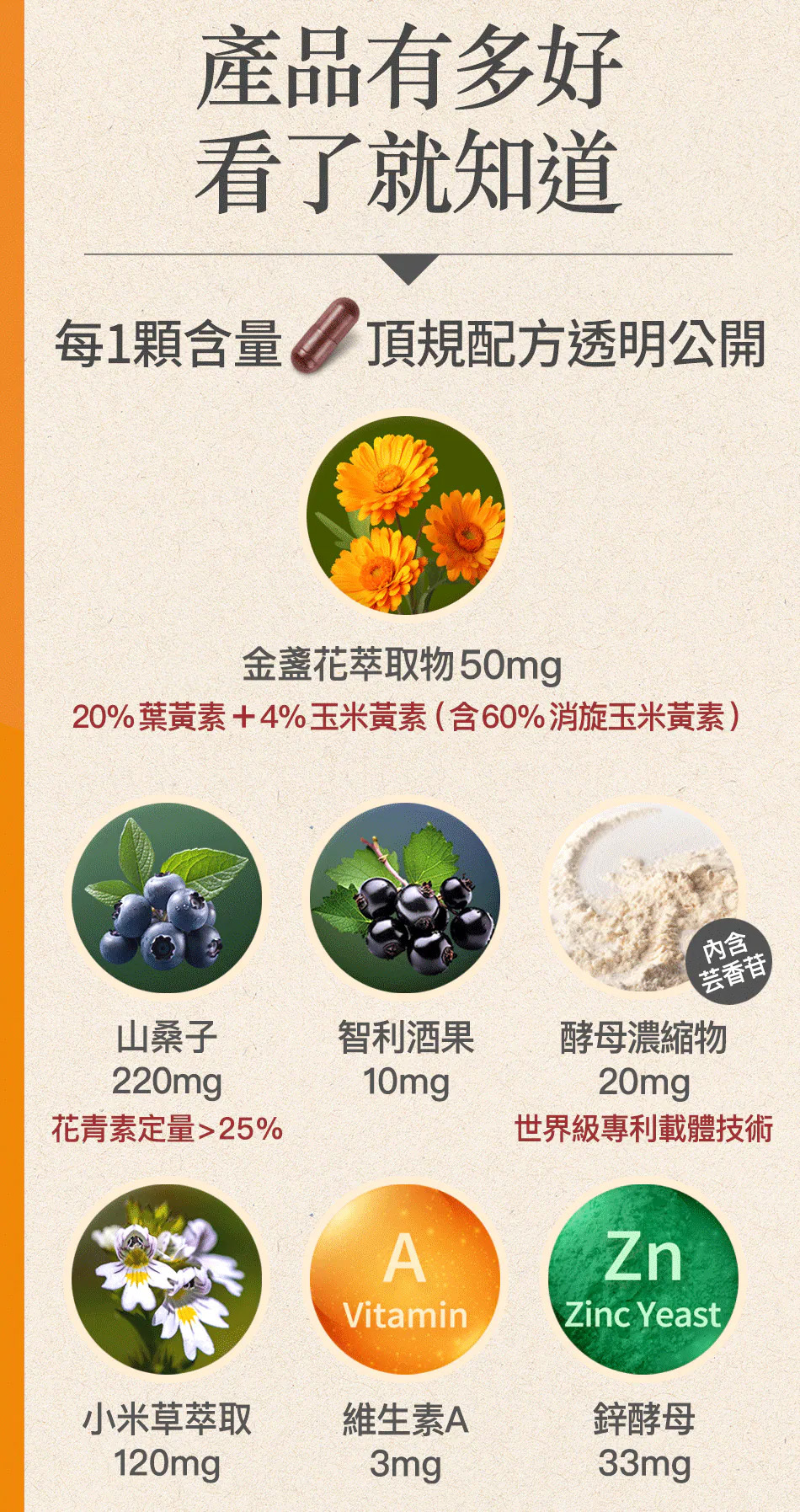 金盞花葉黃素max蘊含花青素55mg以上 (1顆膠囊),營養補給足量有感。