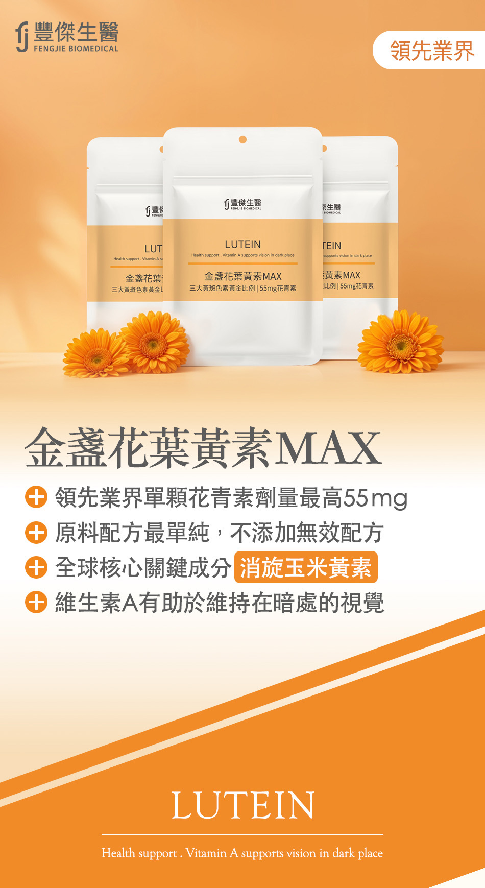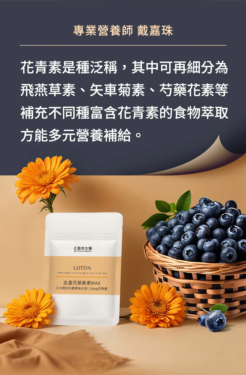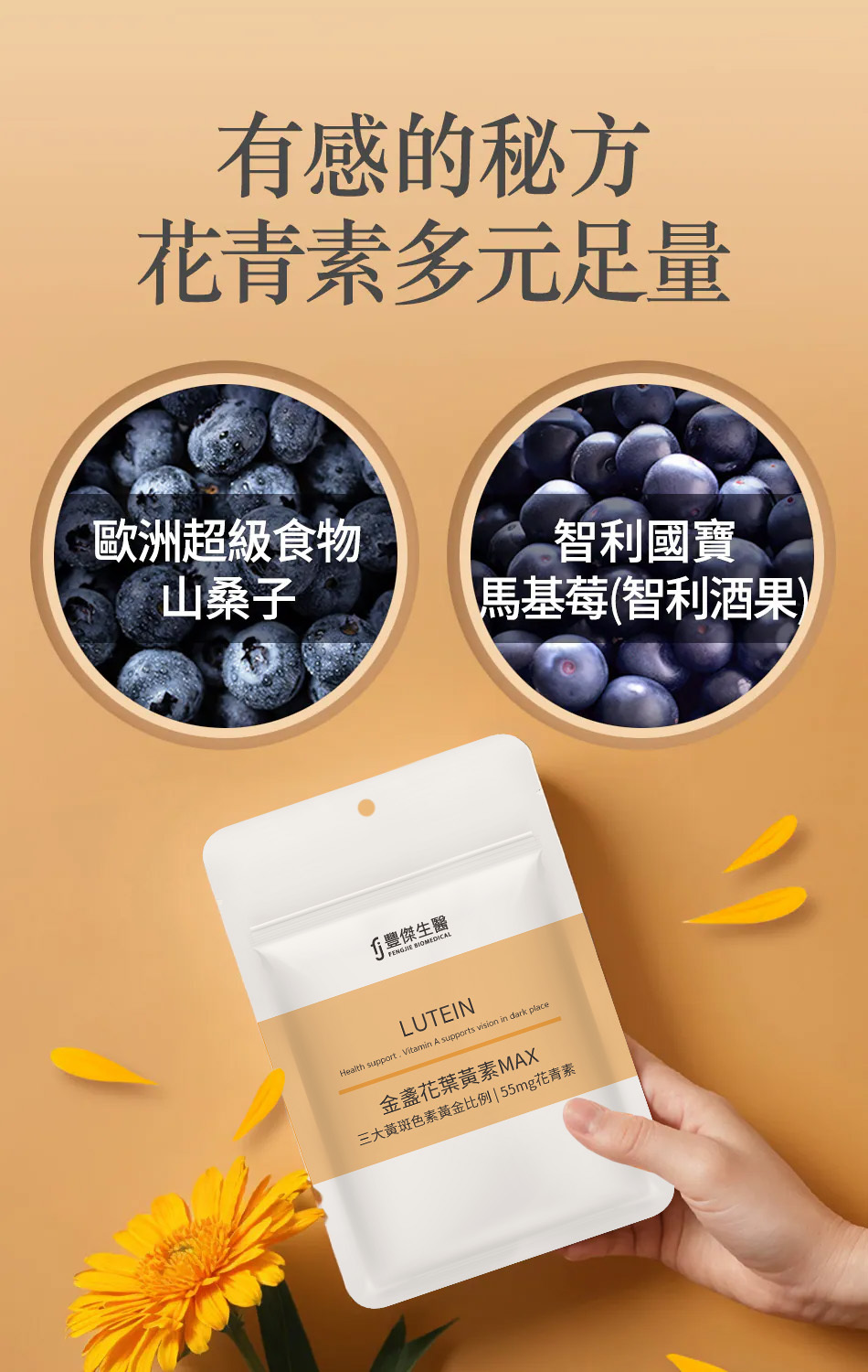 葉黃素與花青素的保健機制不同,共同補充幫助健康維持,尤其金盞花葉黃素MAX的花青素添加至55mg以上,滿足一日所需,更能加強營養補給。