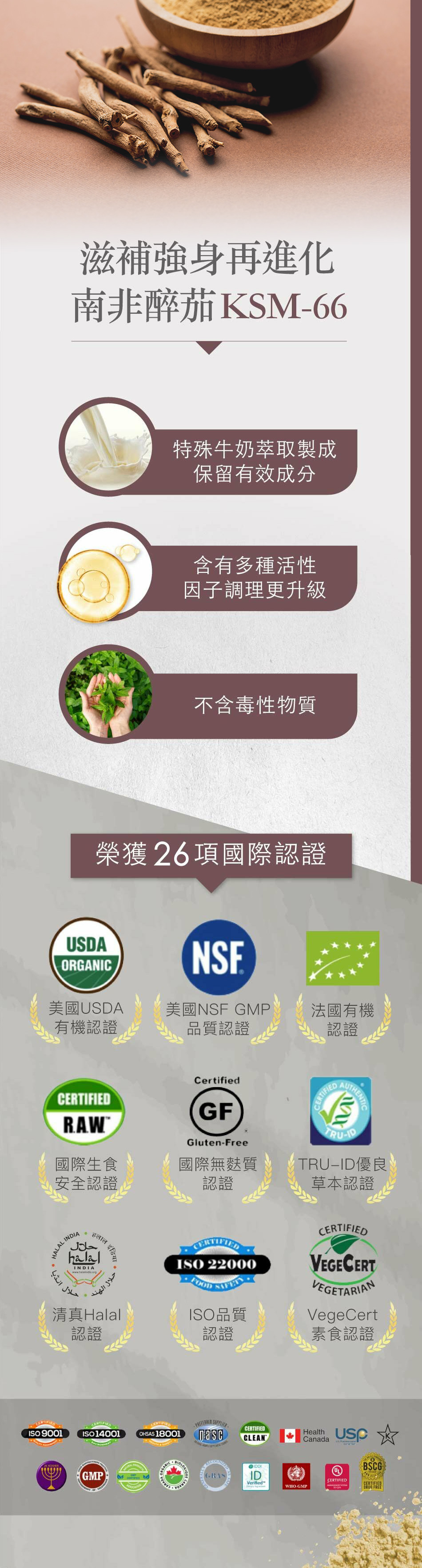 南非醉茄又稱印度人參,是印度古老的植物,通常萃取自其植物的根部,含有多種獨特活性成分如生物鹼、皂苷及胺基酸等,常作為瑪卡的複方成分使用。