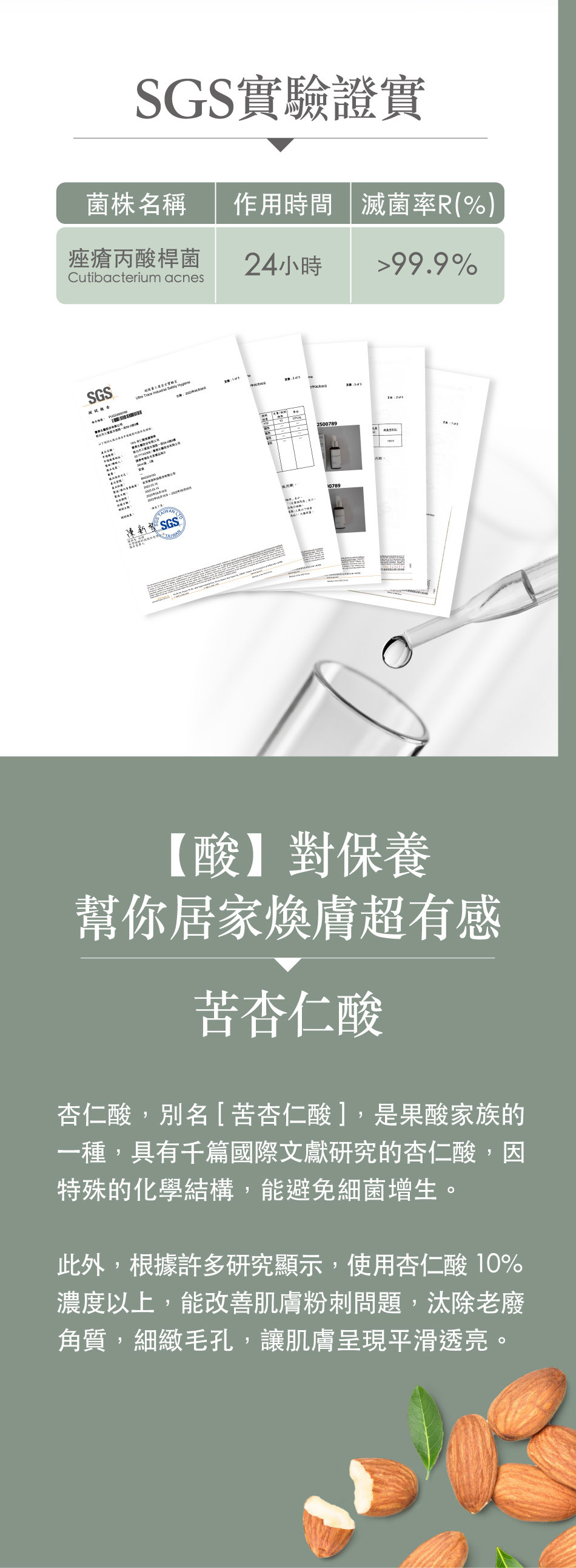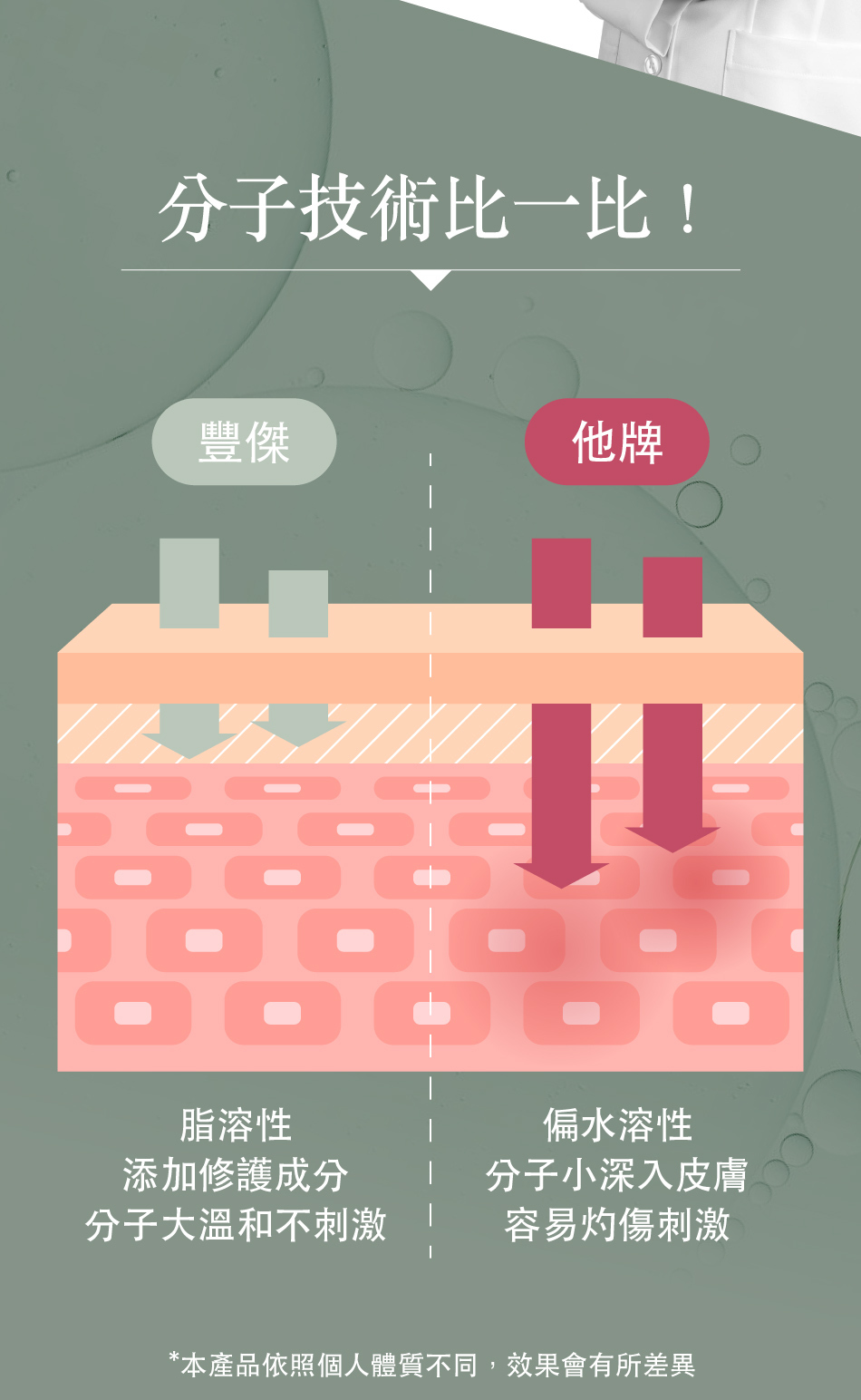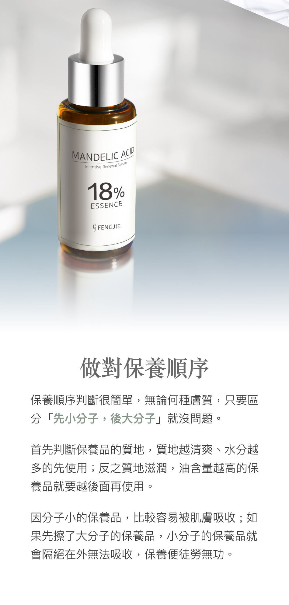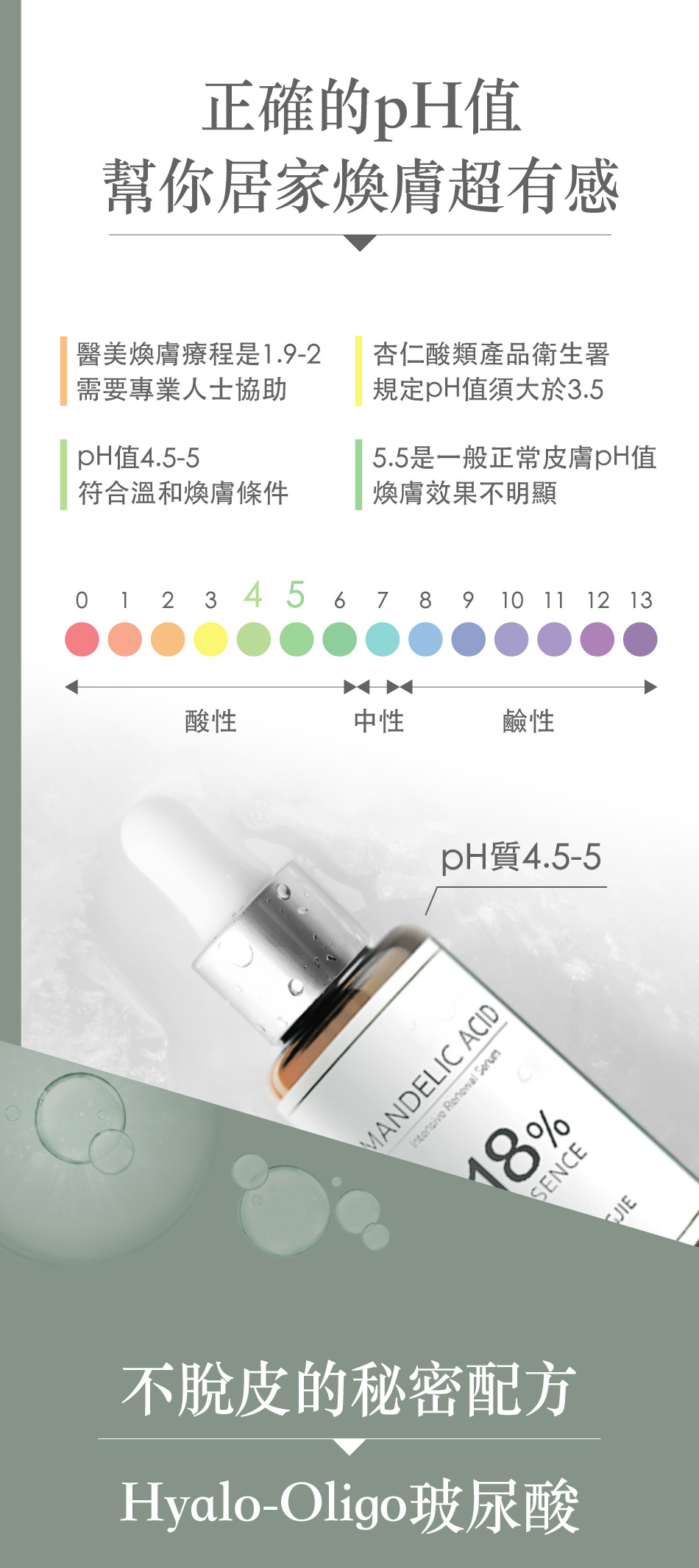 杏仁酸產品有受到法規的管制,濃度不能低於pH值3.5,且經過豐傑的實驗檢測,發現18%杏仁酸是最適宜的濃度,無論在煥白、角質代謝、都能有感地溫和保養。