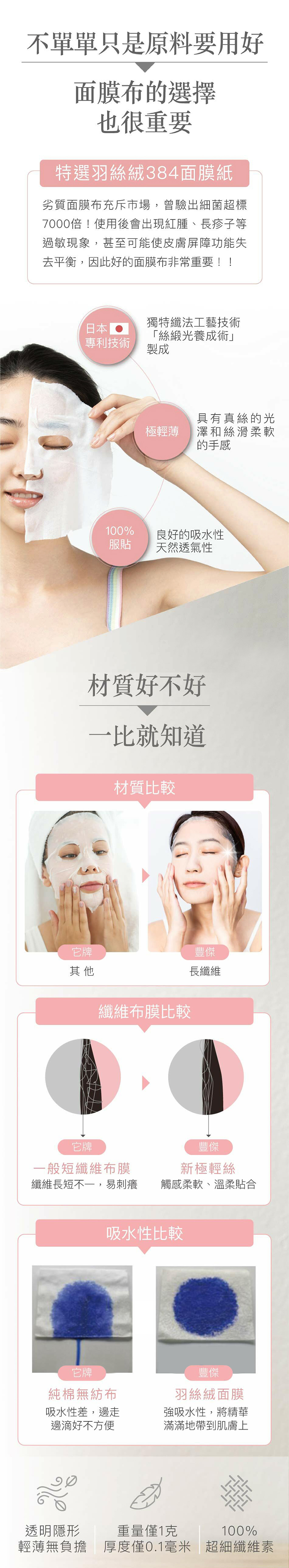 不計成本採用日本製的羽絲縷質料:100%棉籽絨只取10%的精華纖維,敷在臉上幾乎感覺不到存在,細長的纖維更有彈力與韌性,照顧到肌膚各個角落,因特殊織法特性,能與肌膚完全貼合。