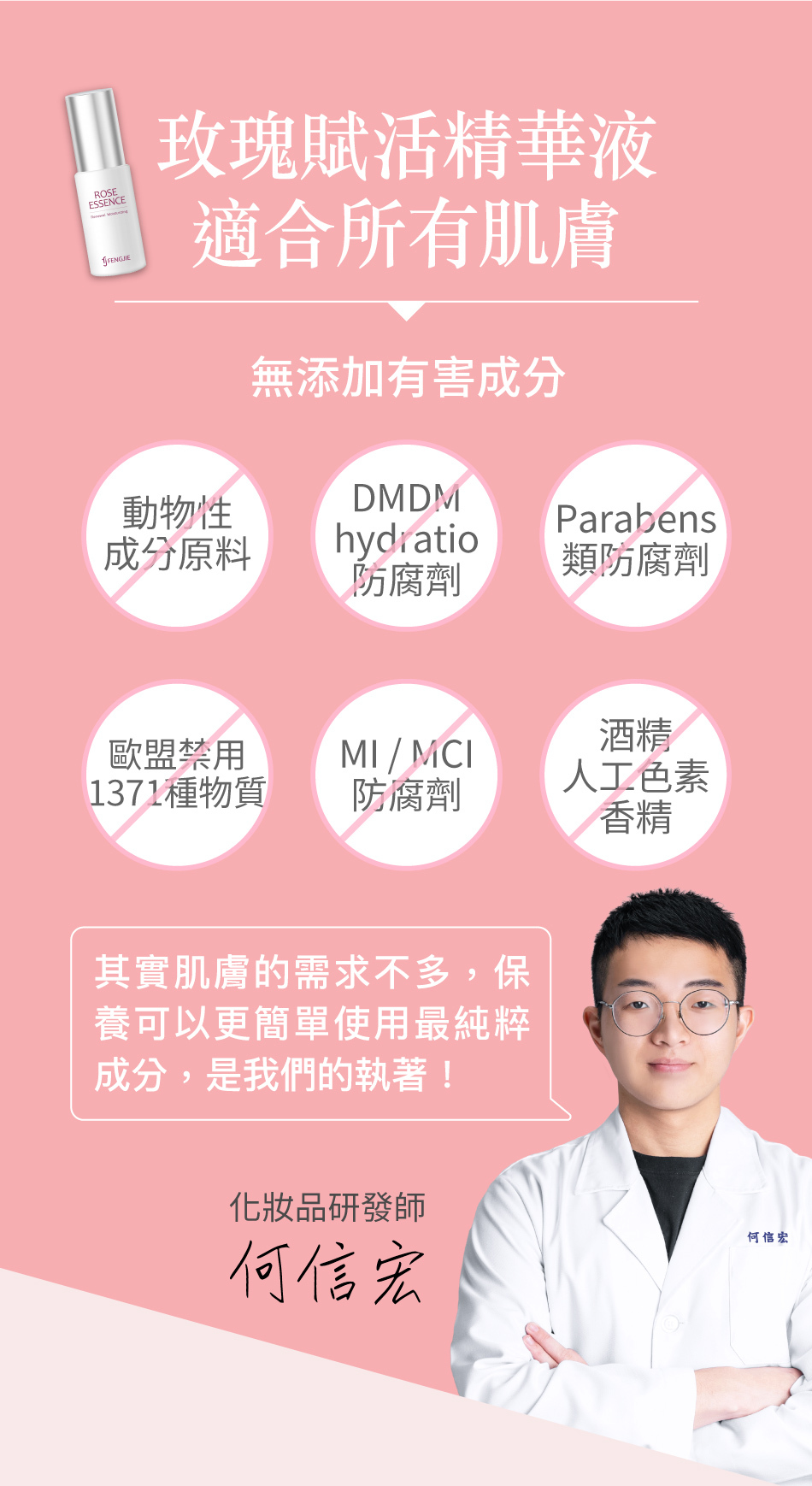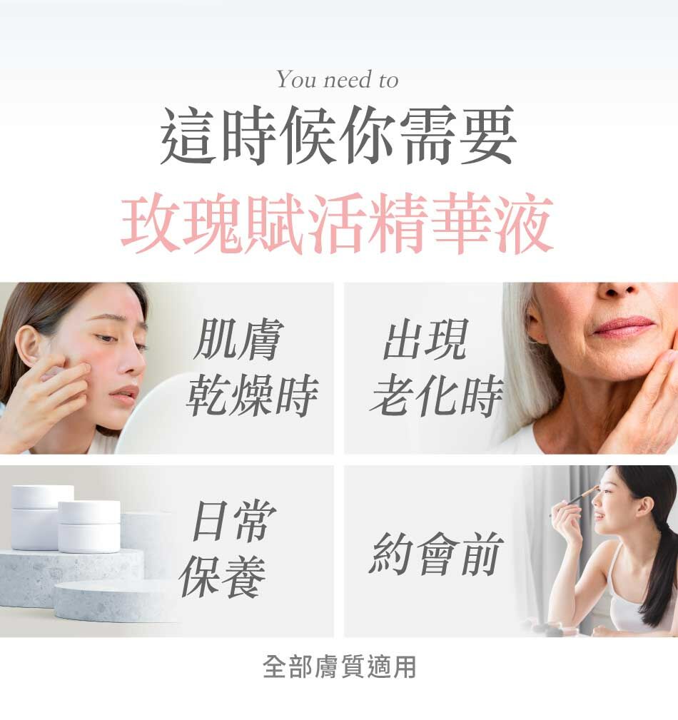 玫瑰賦活精華液成分屬天然植萃,眼下、眼周細紋都可以安心使用。