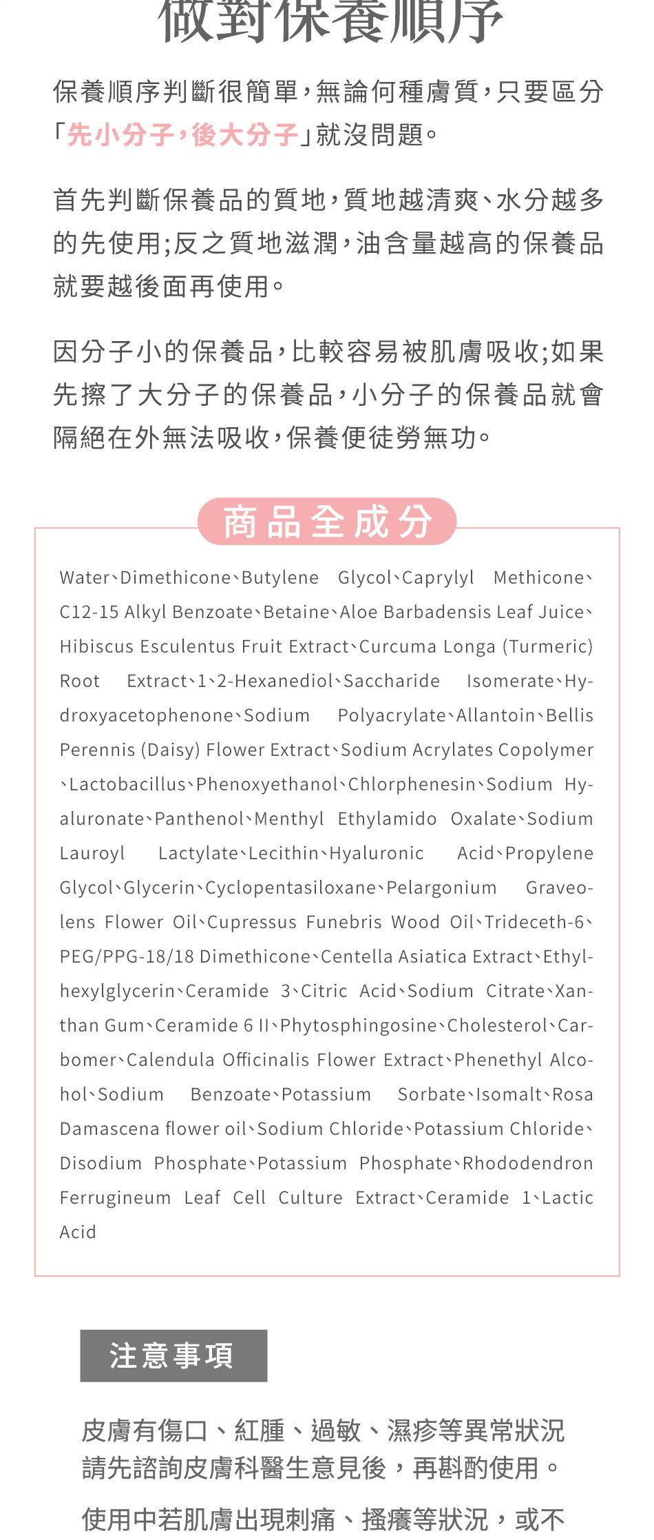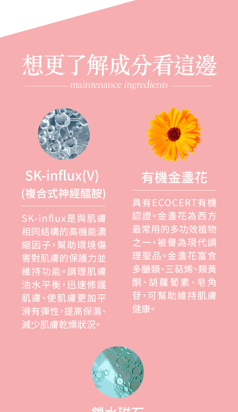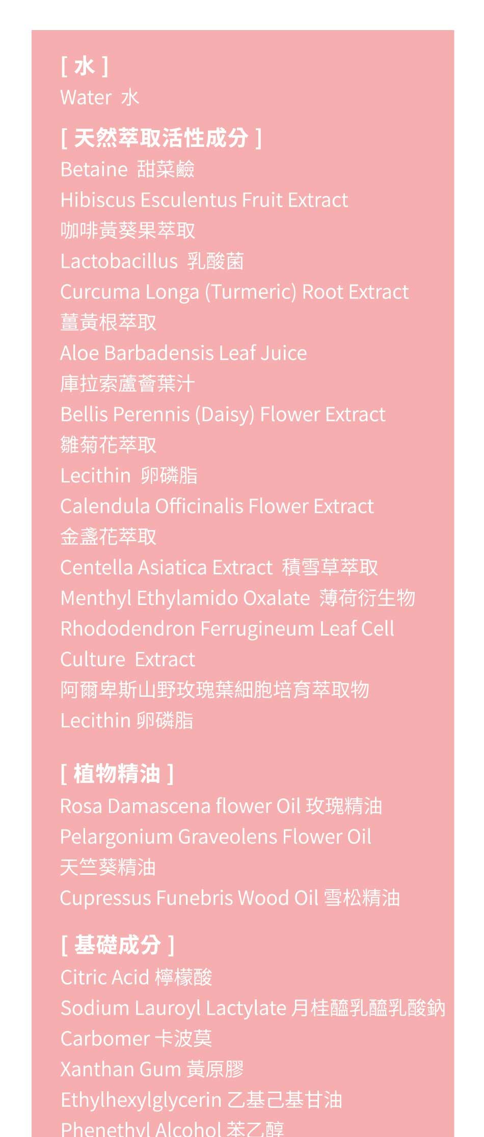 主要包含阿爾卑斯山玫瑰細胞精華、雛菊萃取、積雪草萃取、有機金盞花、鎖水磁石;保濕精華成分包含神經醯胺、玻尿酸等多種精華成分。