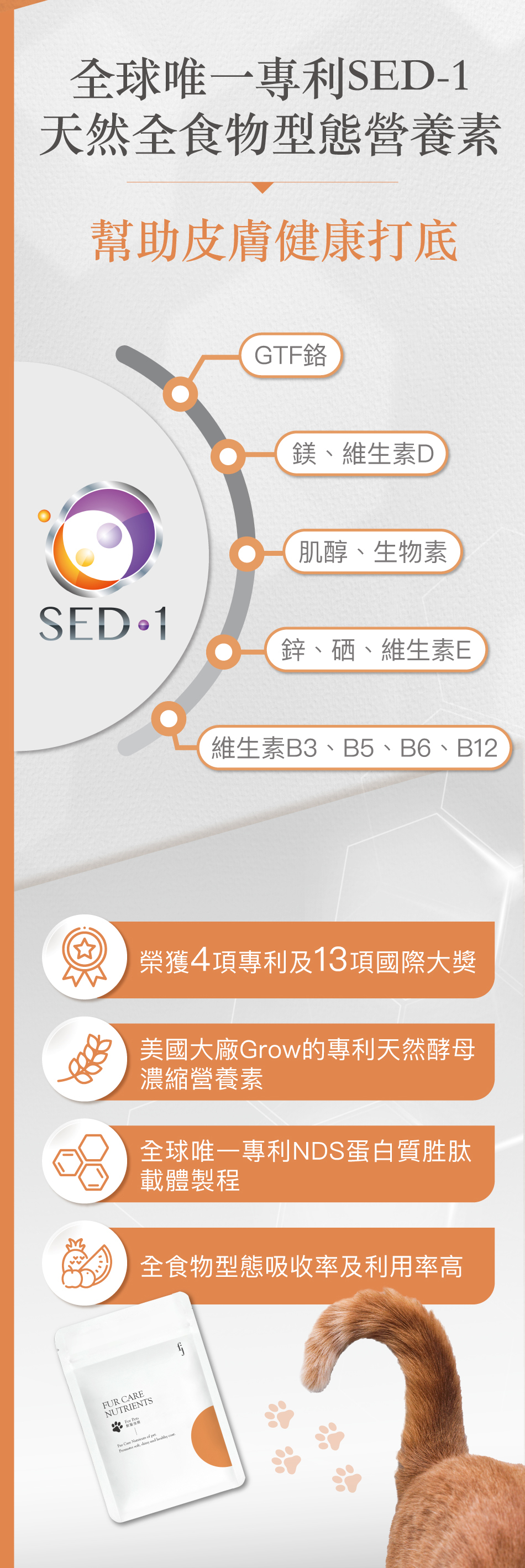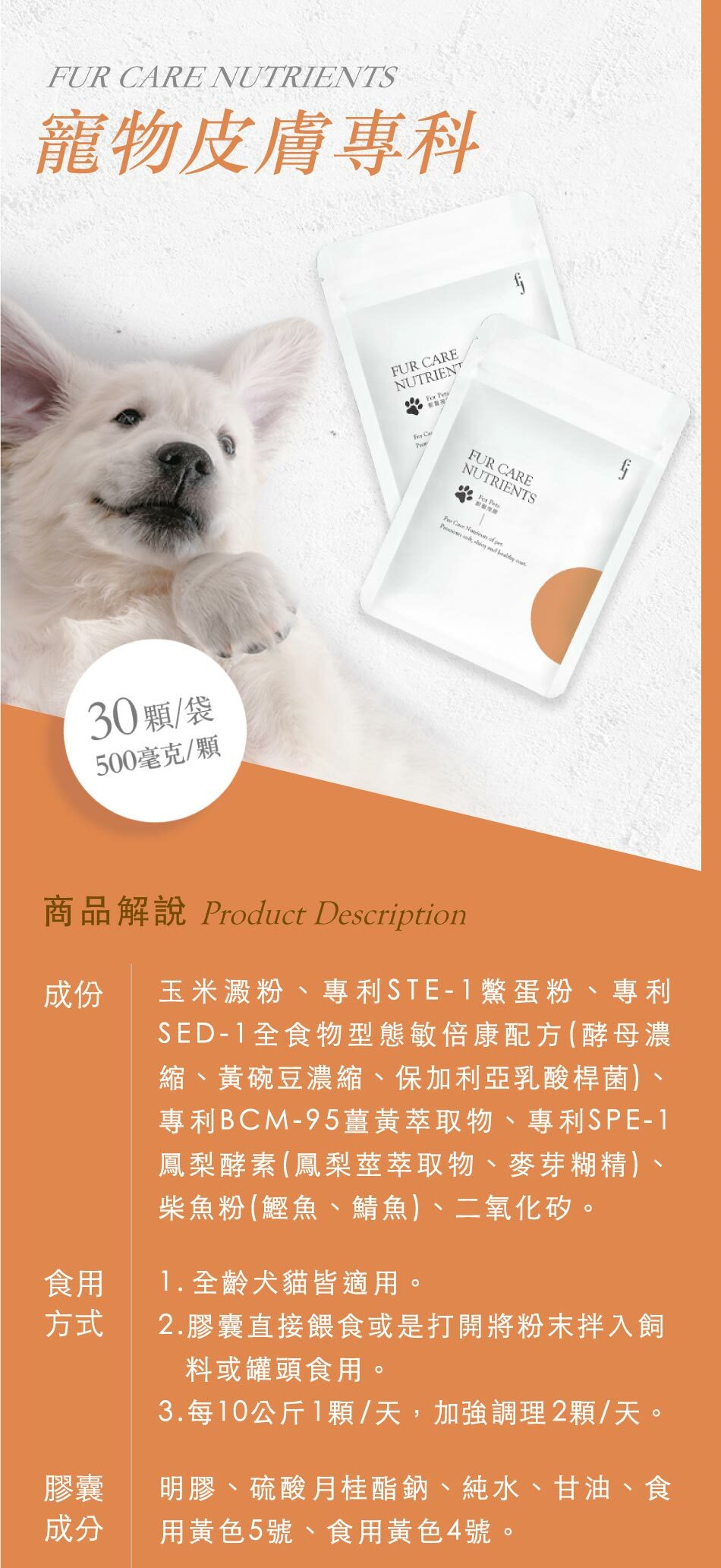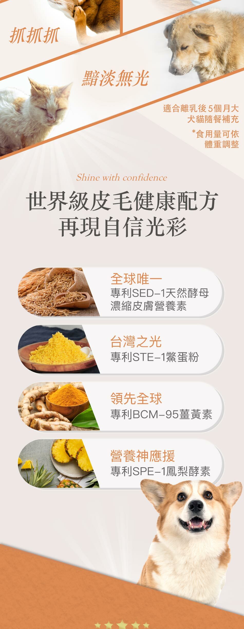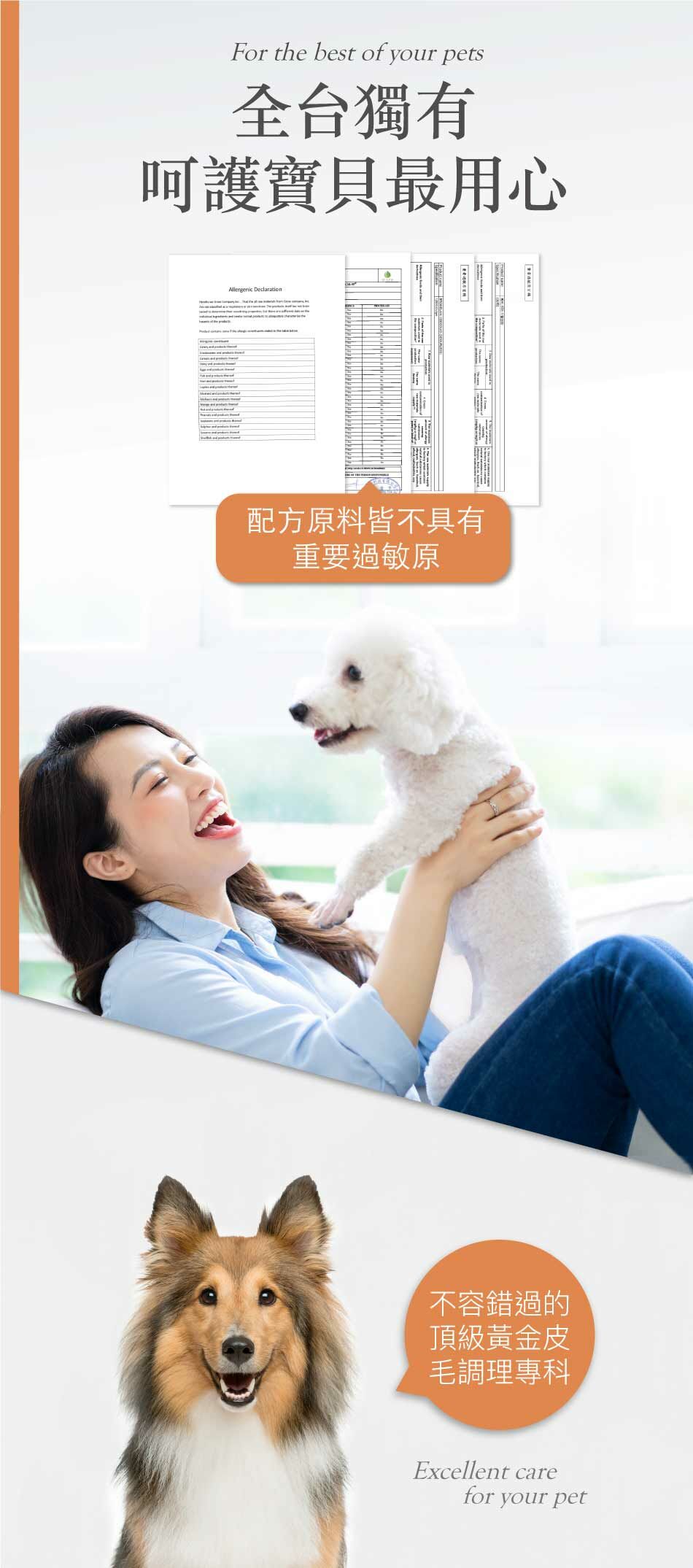 世界唯一100%全天然食物型態營養補充品,安全無負擔,並富含生物素、肌醇、維生素B群、維生素D/E、硒、鋅、鎂、鉻等綜合營養,從根本增進毛孩皮膚的健康。
