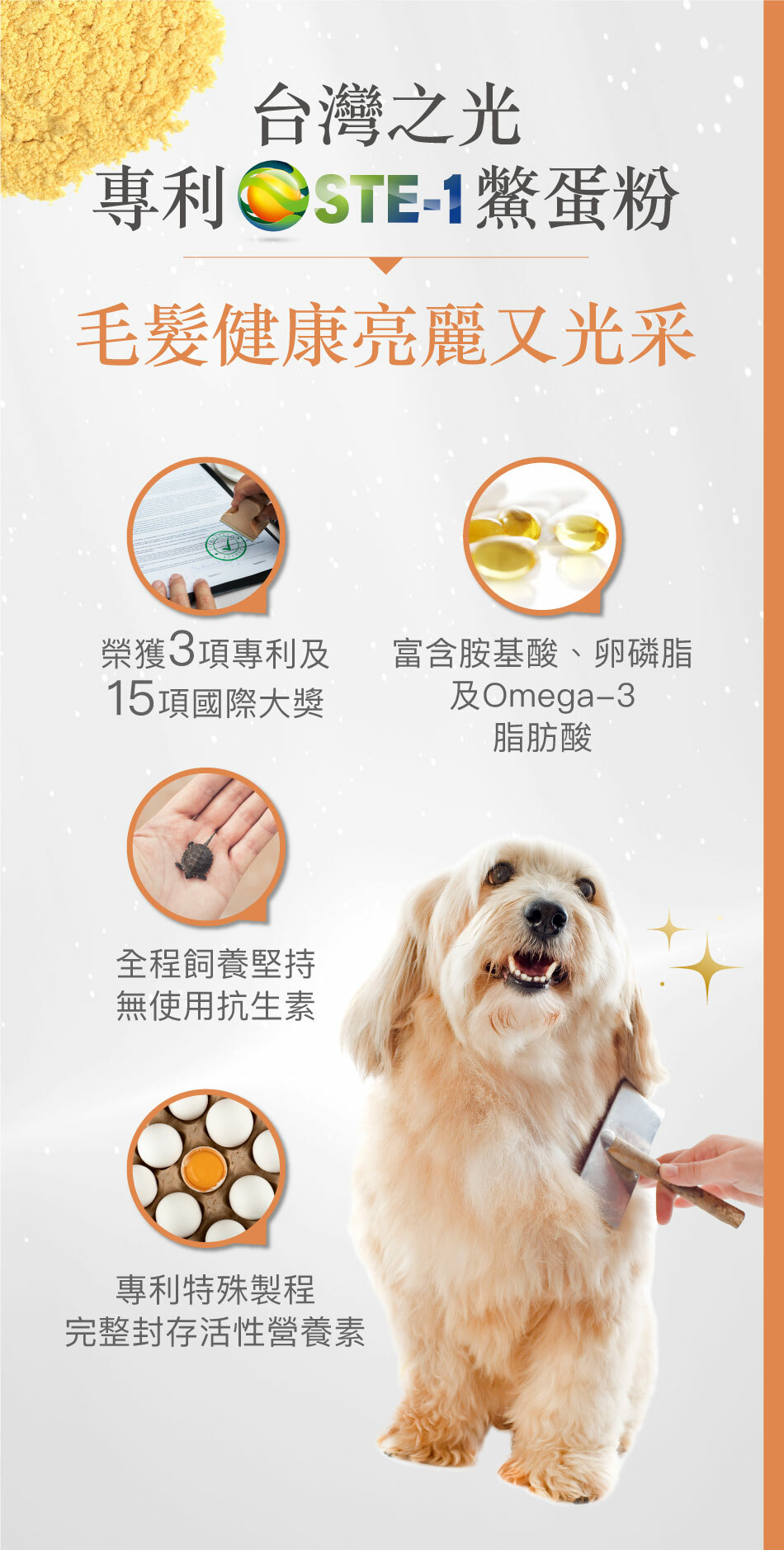 說到「爆毛、美毛」,第一時間就會想到鱉蛋粉,鱉蛋粉又稱「甲魚蛋」,除了是優質的蛋白質來源,富含卵磷脂、核黃素、礦物質、DHA&EPA,能提供毛孩皮膚毛髮所需營養,豐傑採用台灣專利鱉蛋粉,榮獲3項專利及15項國際大獎!