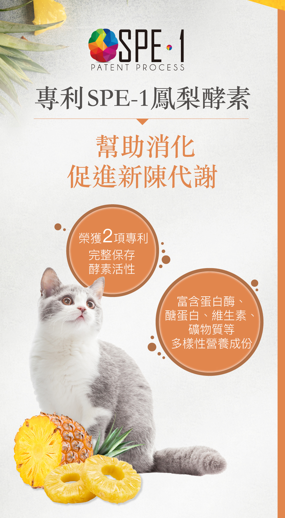 SPE-1取自鳳梨的莖部,其營養成分與酵素含量比果實部位更加豐富優質,專利技術完整保留酵素活性,可幫助毛孩促進新陳代謝、幫助消化。