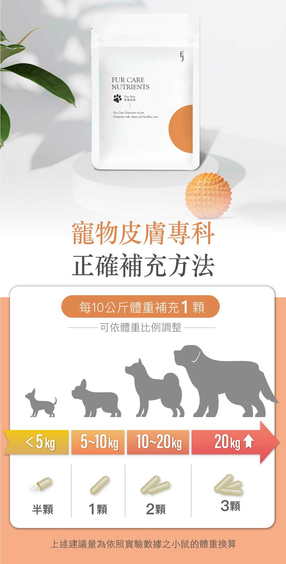 我們的寵物皮膚專科成分溫和,幼貓、幼犬都可以吃哦!建議離乳後的犬貓,5公斤內每天半顆,補充即可。