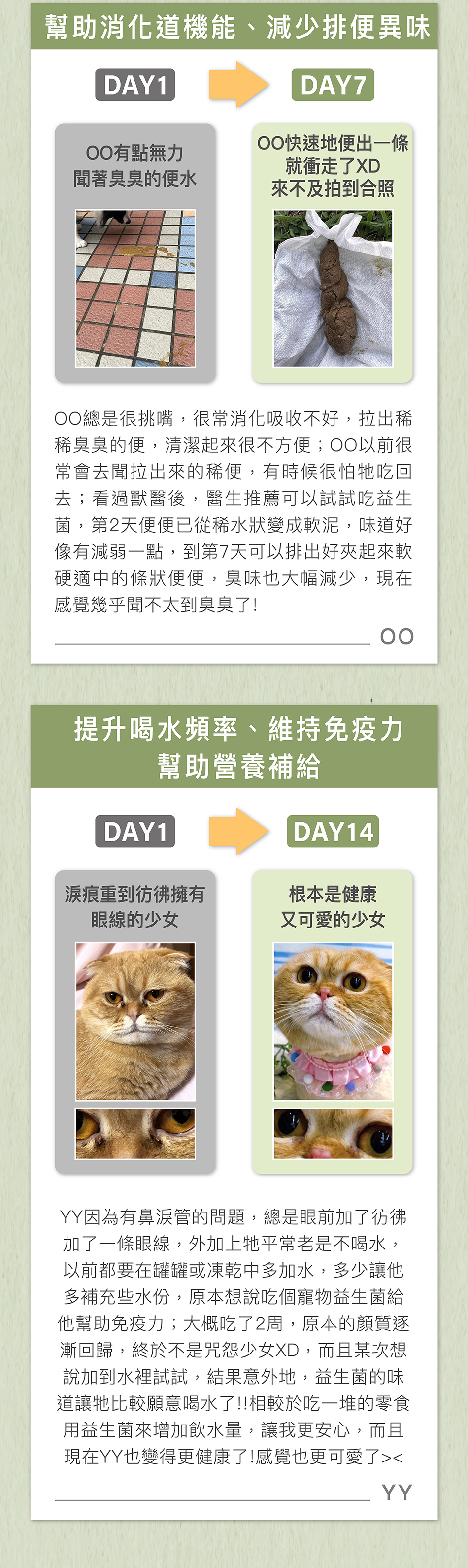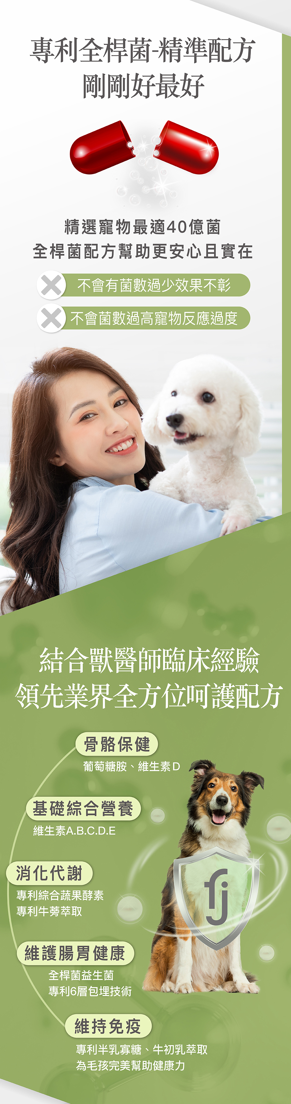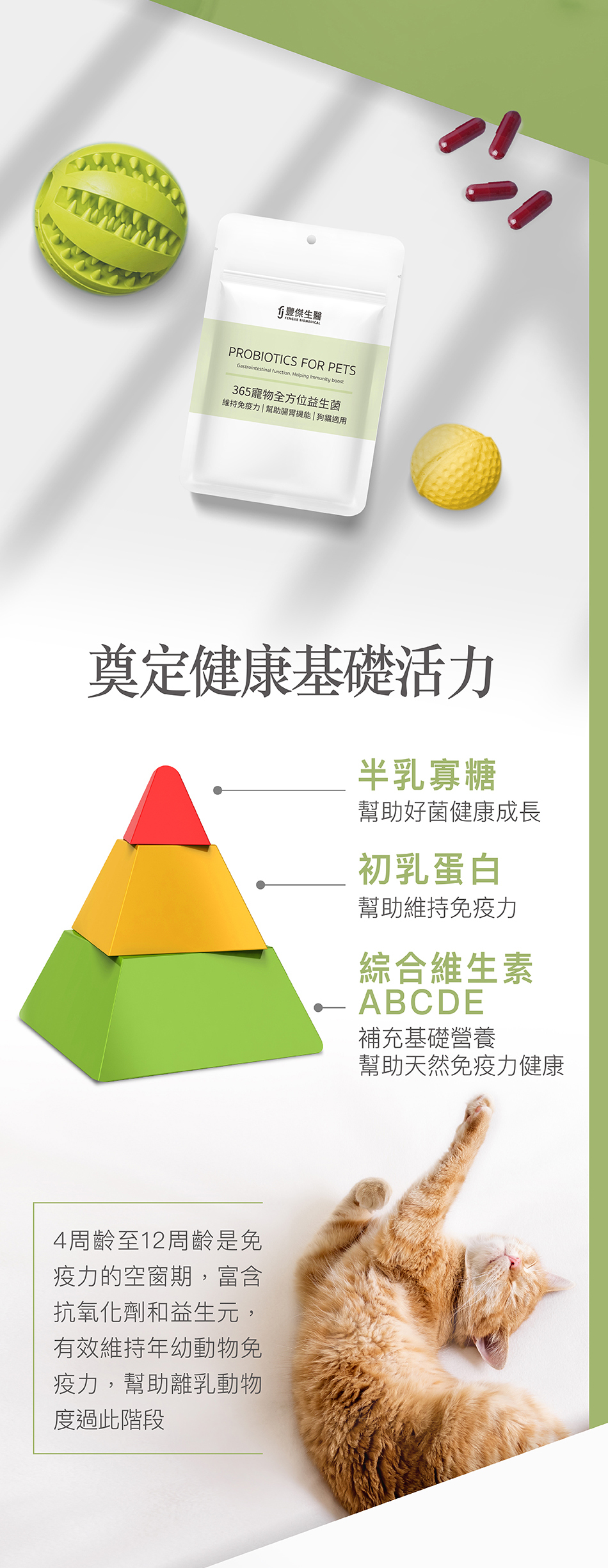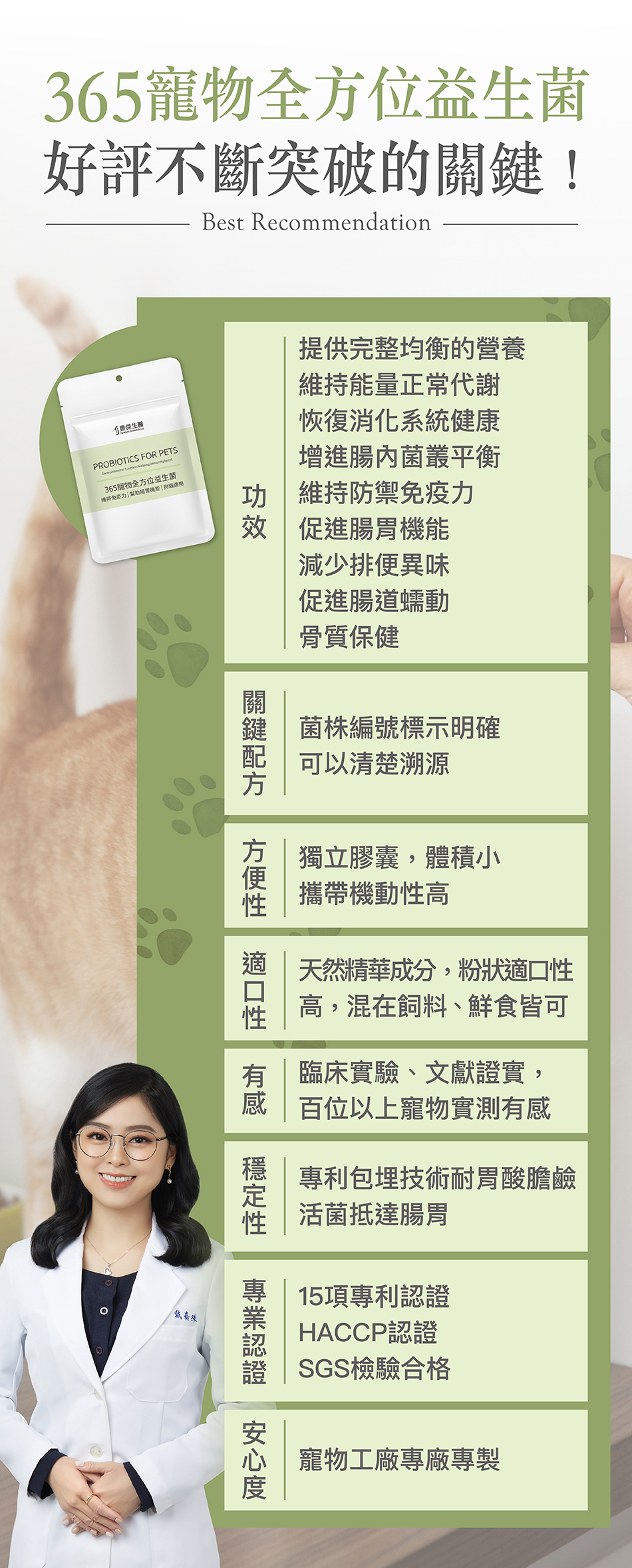 益生菌為營養保健食品,建議每天穩定持續補充,讓毛孩增進腸內菌叢品質,維持最佳狀態喔!