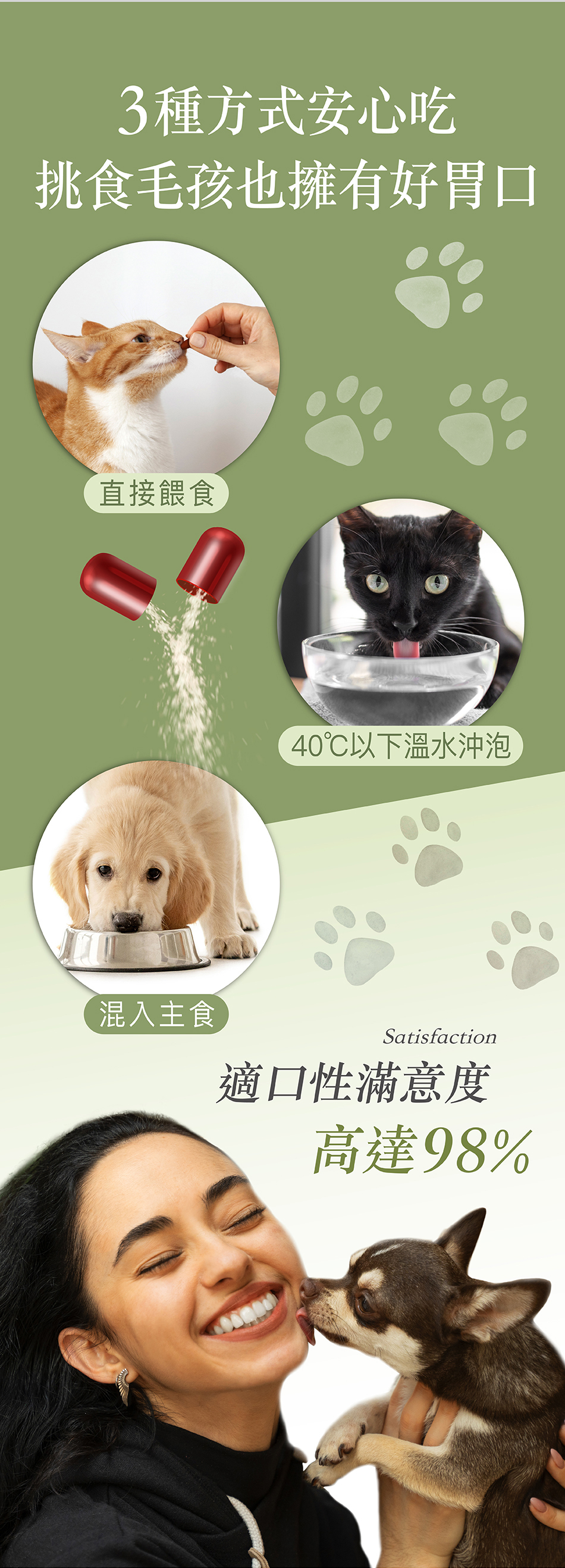 經100位毛孩測試,98位回饋適口性良好。因成分有搭配牛初乳蛋白,是淡淡的微香味,毛孩會更喜歡喔。