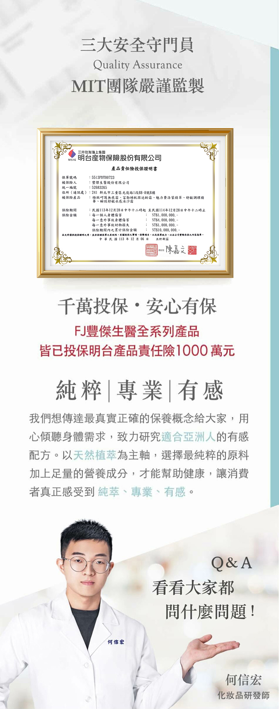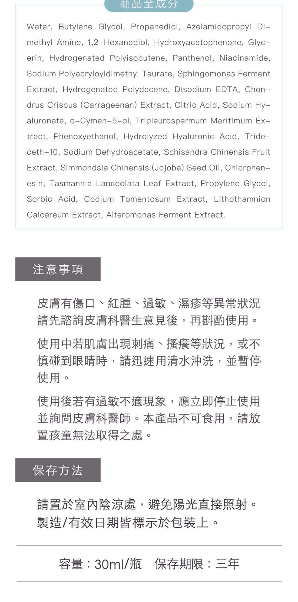 豐傑針對敏感肌族群,加入了Epi-On TM舒敏因子、氨基酸、玻尿酸、神經醯胺、荷荷芭油、多醣體、胡椒莓萃取、五味子萃取、海藻膠、洋甘菊蒸餾液等功效成分,全方位修護肌膚狀態!