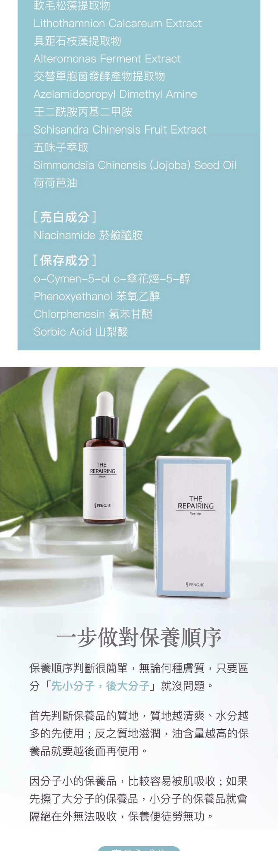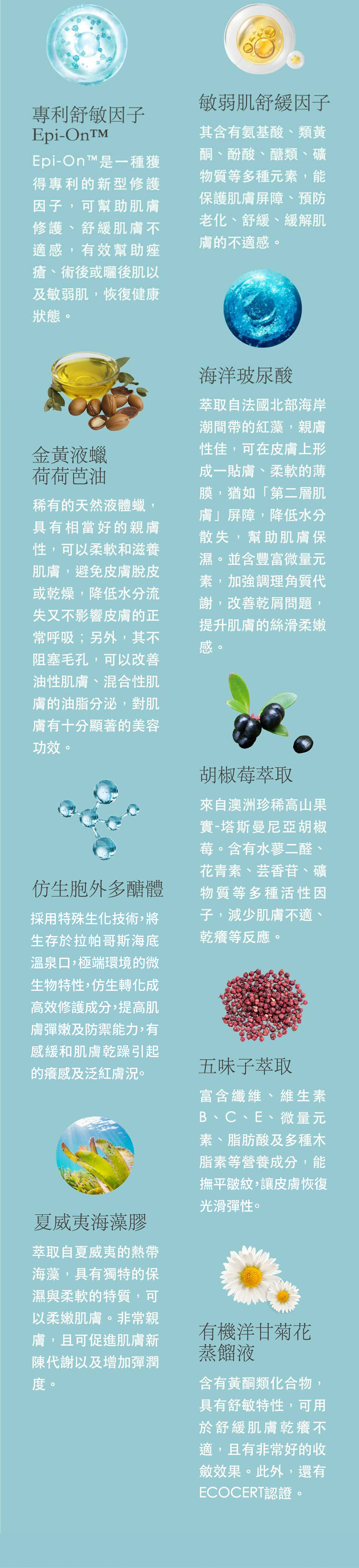 豐傑針對敏感肌族群,加入了Epi-On TM舒敏因子、氨基酸、玻尿酸、神經醯胺、荷荷芭油、多醣體、胡椒莓萃取、五味子萃取、海藻膠、洋甘菊蒸餾液等功效成分,全方位修護肌膚狀態!