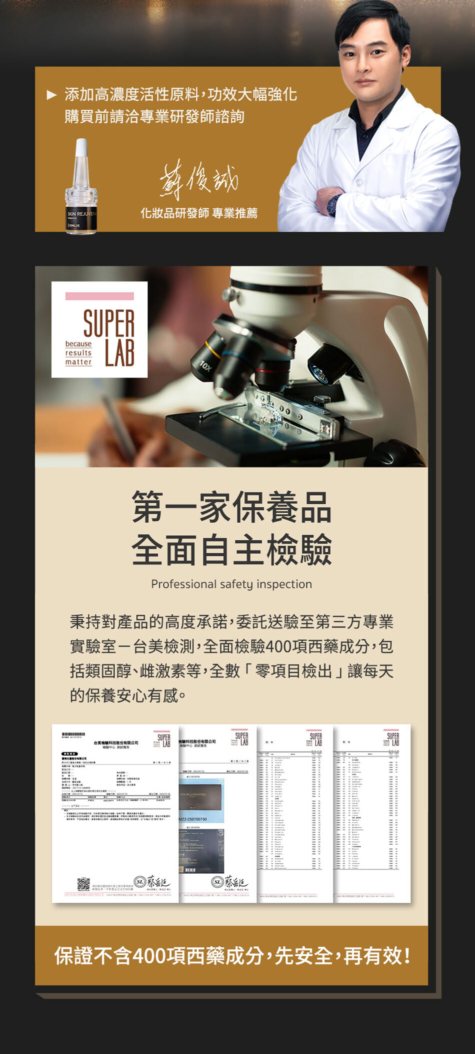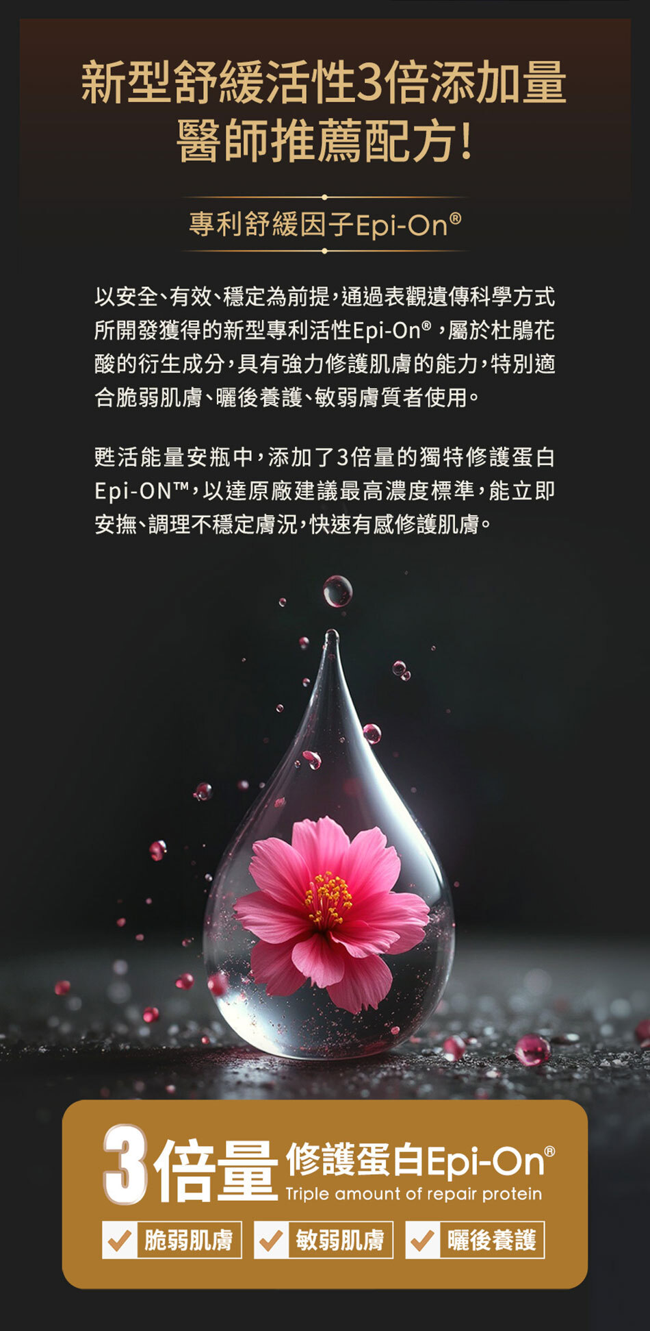 添加三倍濃度皮膚科醫師認證術後使用的【專利舒緩因子】,搭配頂級專利成分冰甦活能量菌,無刺激性成分純淨度高,亦可高效修護肌膚。