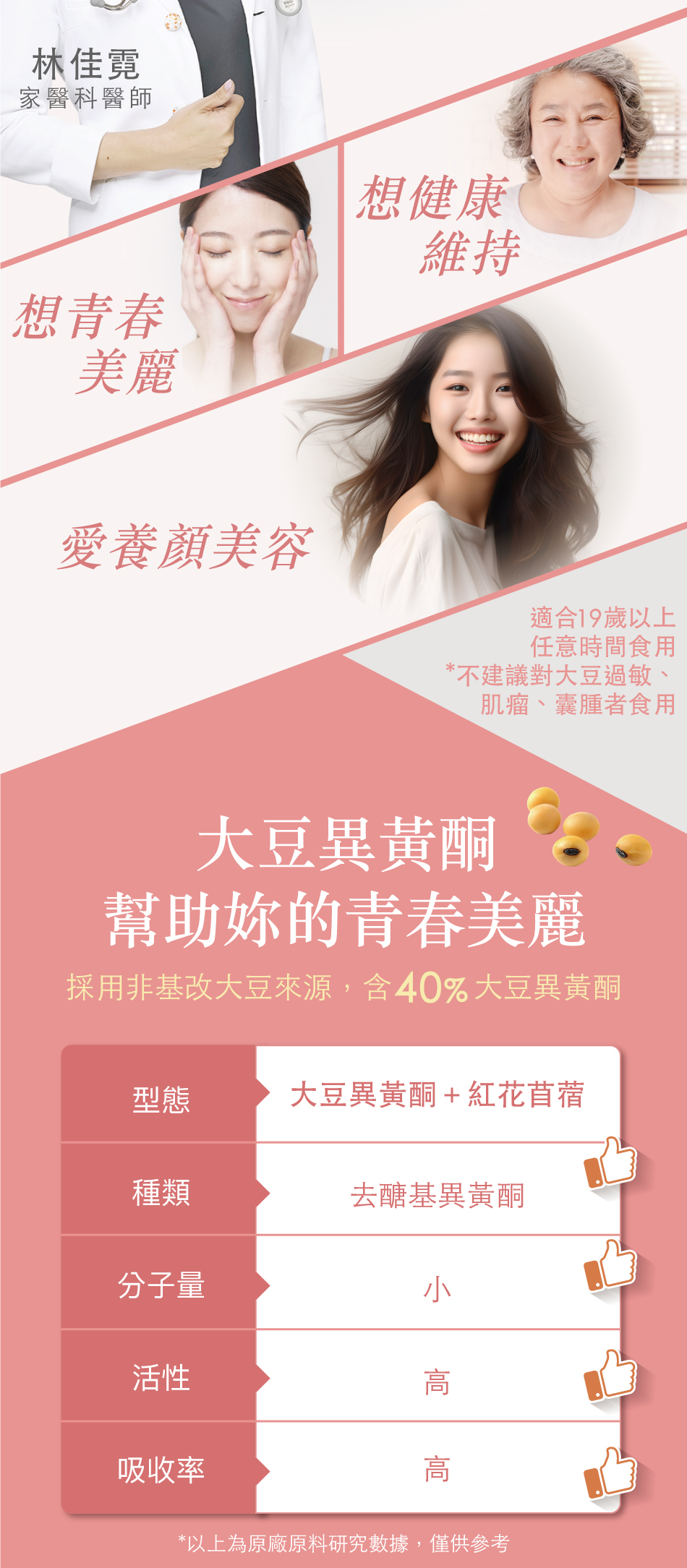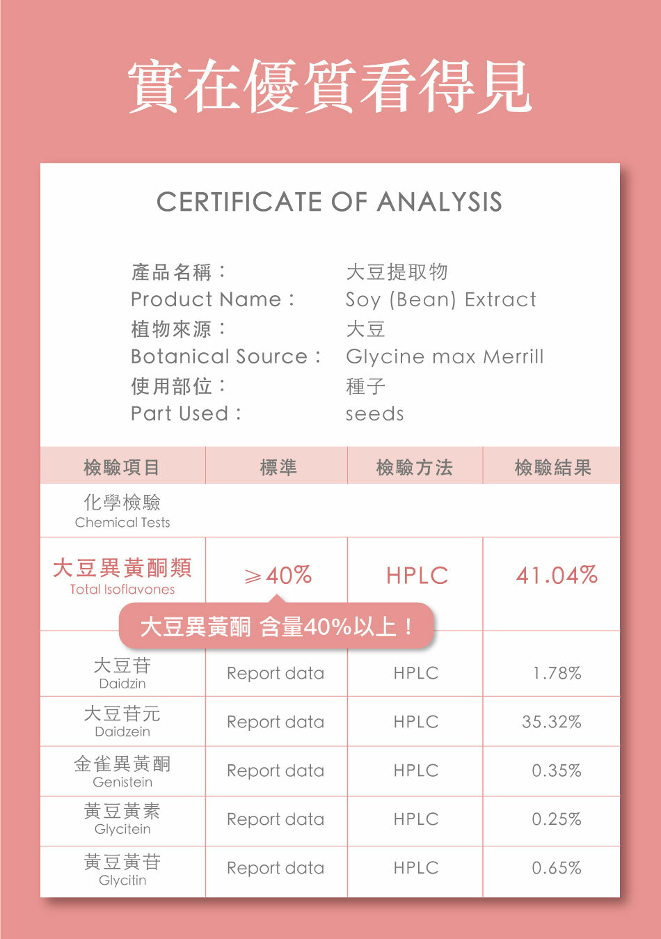 ➤ 含40%大豆異黃酮,多種植物性異黃酮素