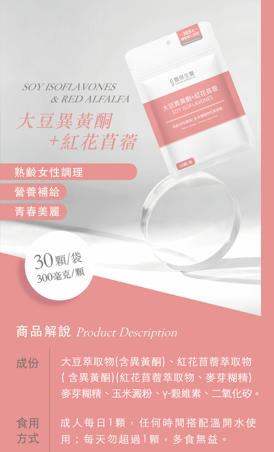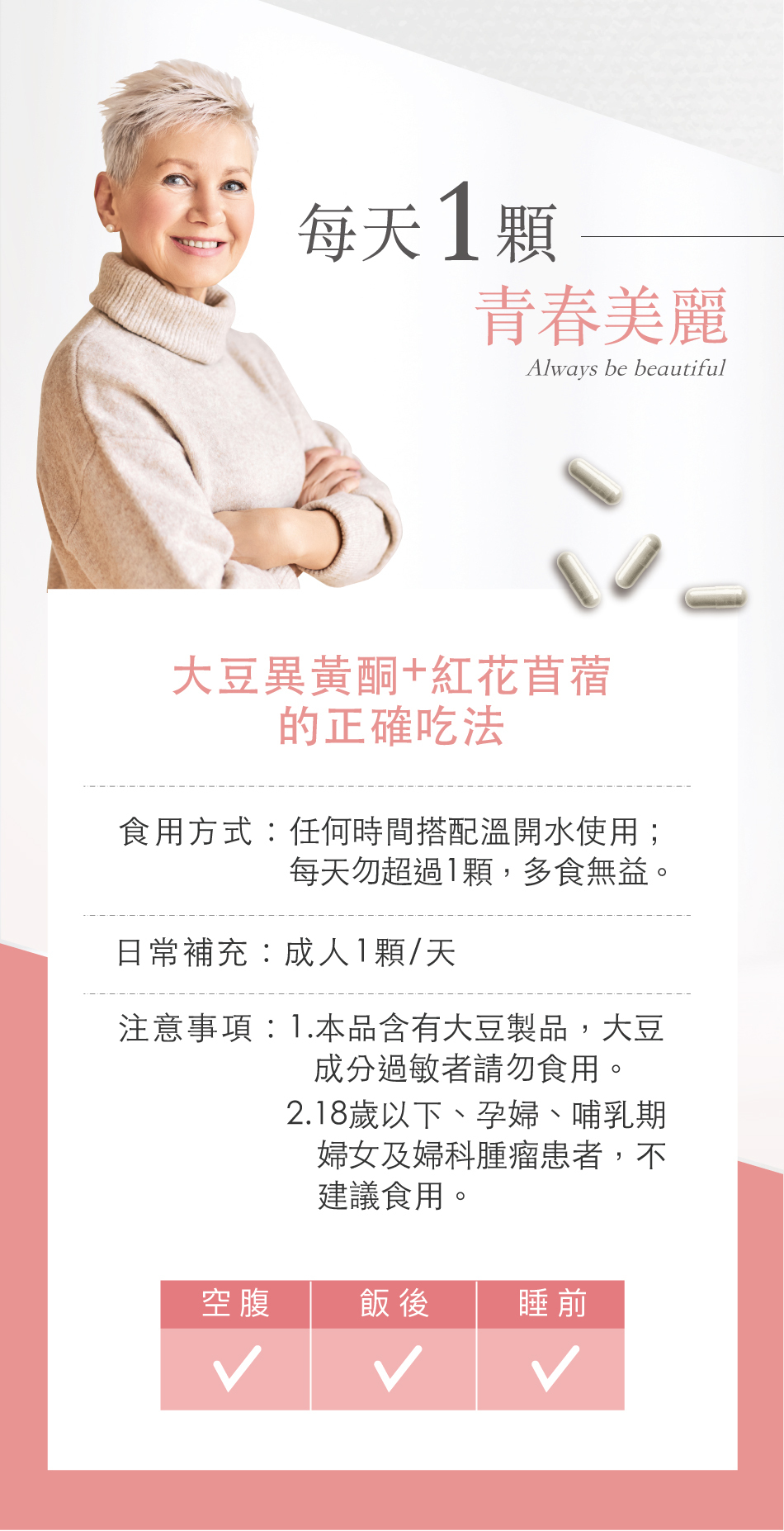 1顆含 去醣基大豆異黃酮萃取物100毫克+紅花苜蓿100毫克