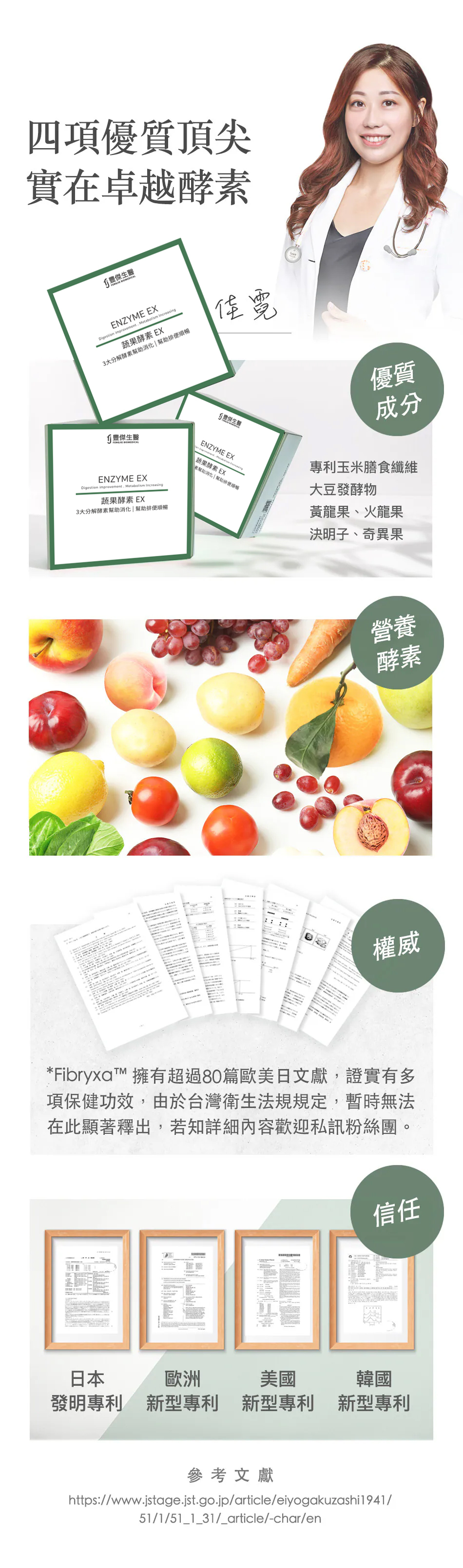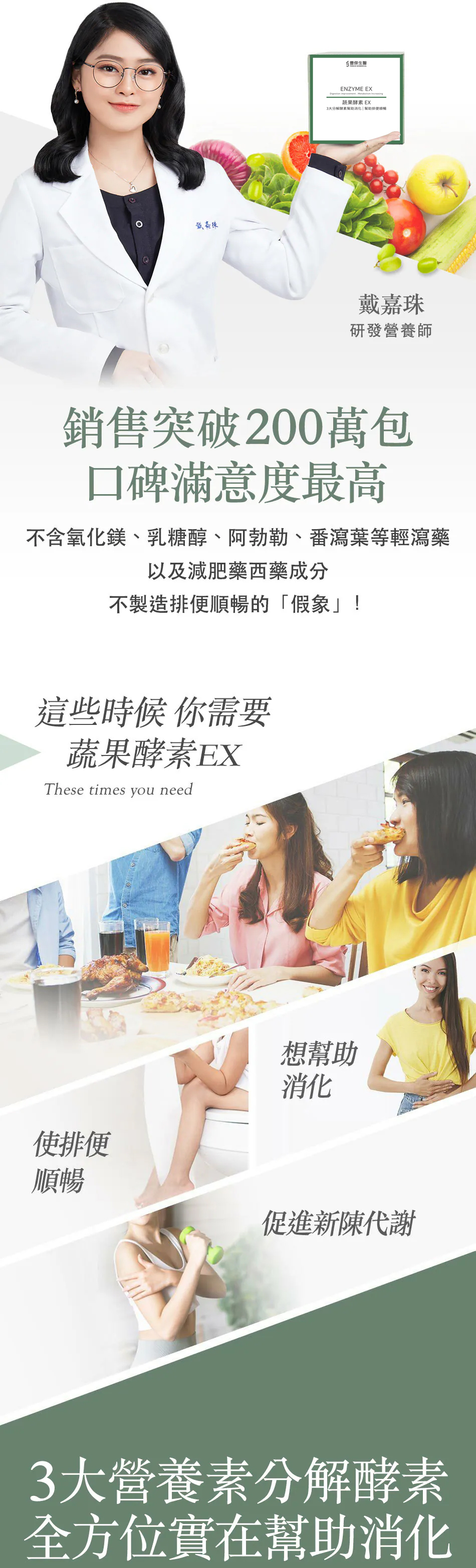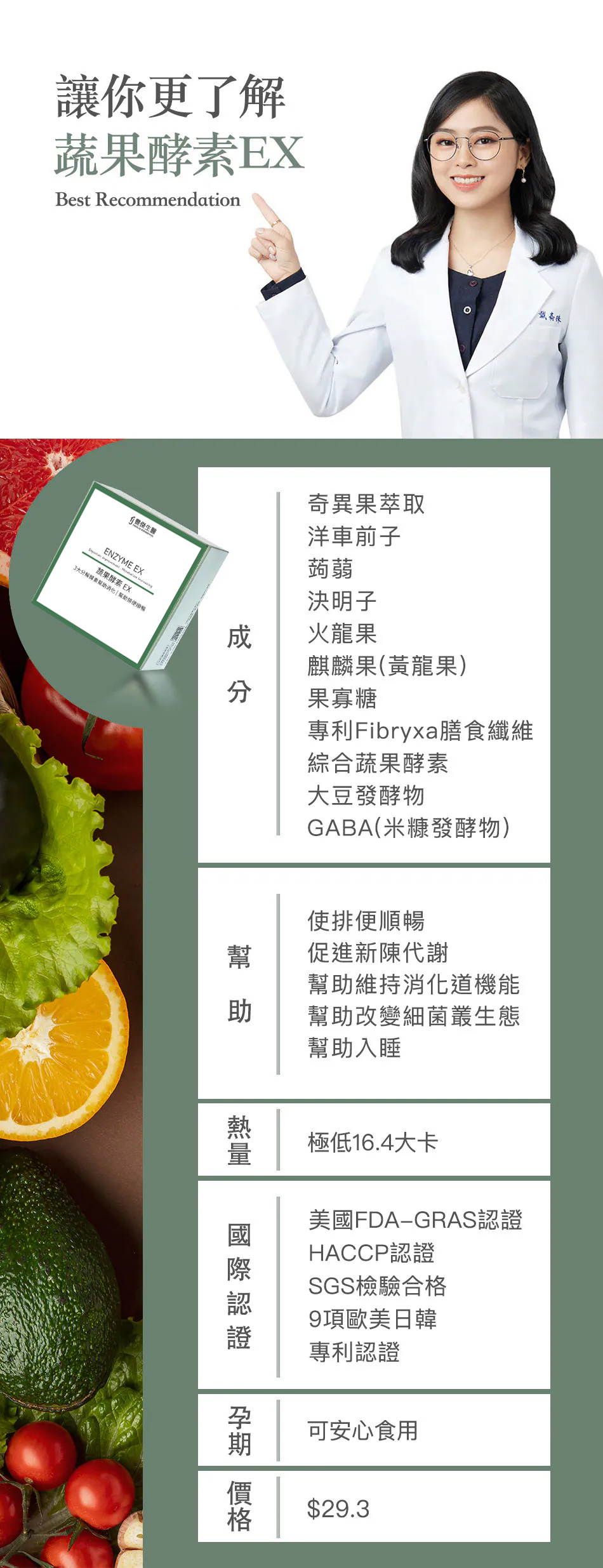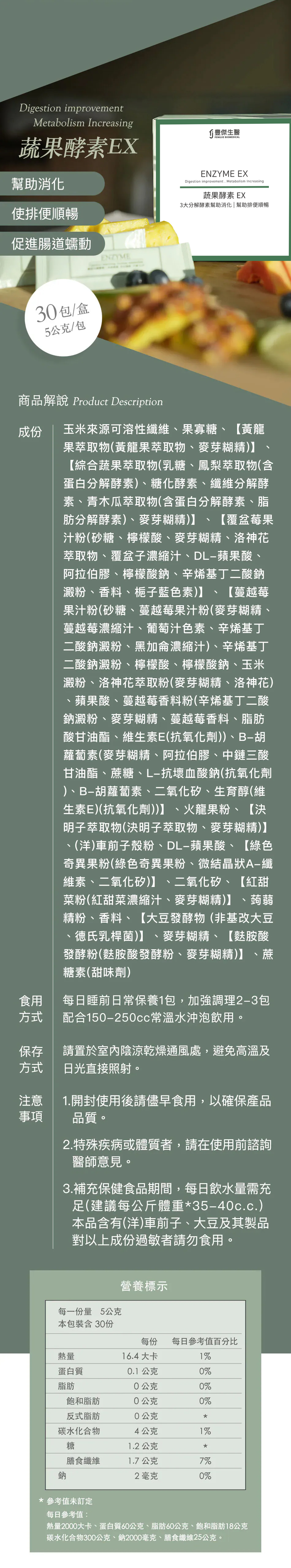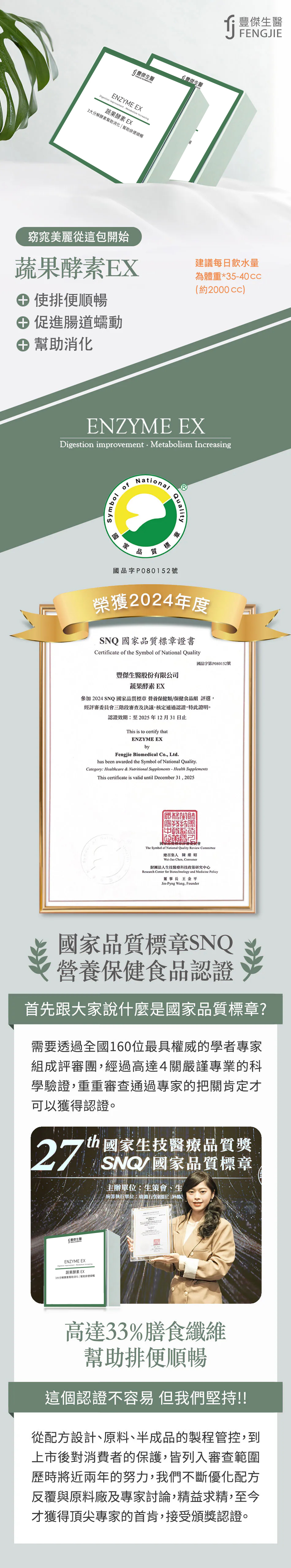 在過去兩年間,我們不斷優化舊版酵素配方,除了提升蔬果的豐富度,還增加了膳食纖維含量,達成了黃金比例的雙效膳食纖維配方。為了提供顧客更大的安心保障,進行了酵素活性與膳食纖維含量檢測。結果顯示,酵素活性不僅高於原料數據,每包酵素更含有「高達33%的膳食纖維」,促進腸道蠕動、幫助排便順暢。最重要的是,我們的蔬果酵素EX不含任何瀉藥成分,不同於市面上許多含有瀉藥成分的酵素,讓你享受純淨的配方,食用更安心。此外,還特別委託專業機構,進行菌相實驗,並且通過SNQ國家品質標章認證,讓產品的有感度與安心度更加卓越。