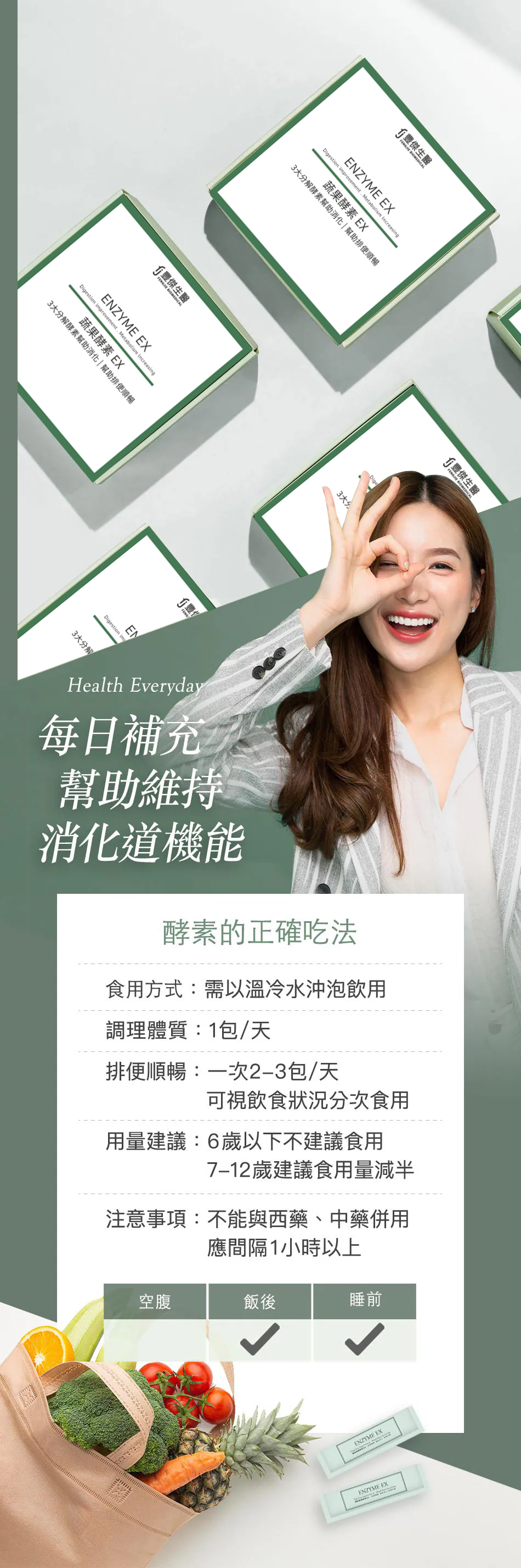 可以自由搭配一天中的最後一餐,如果斷食24小時,可以等開始進食後再搭配酵素喔!