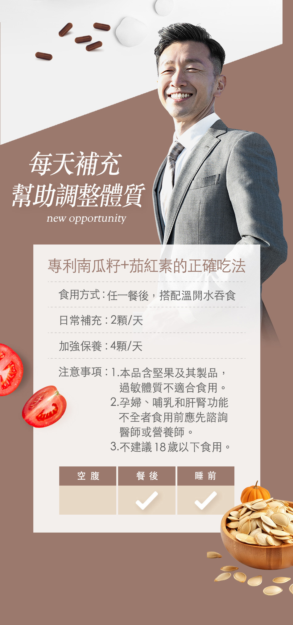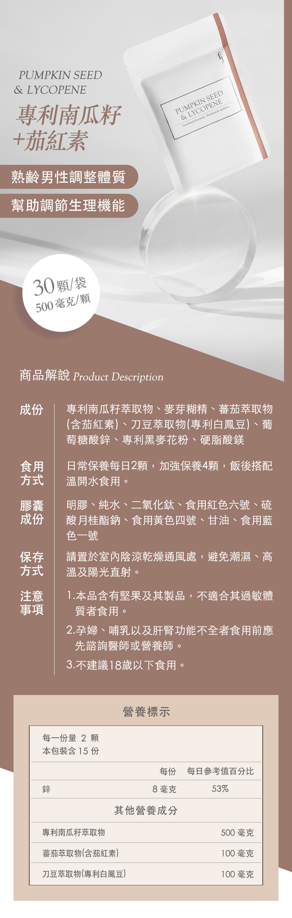 南瓜籽富含高營養價值,其含有極大的鋅(Zinc)含量,不僅是熟齡男性所需,也能幫助女性調節生理機能;不只如此,添加的茄紅素也含有重要的植化素種類,其他如專利黑麥花粉、專利白鳳豆、礦物鋅等,有別於市面上的其他單一配方,給予您多重的安心保障。