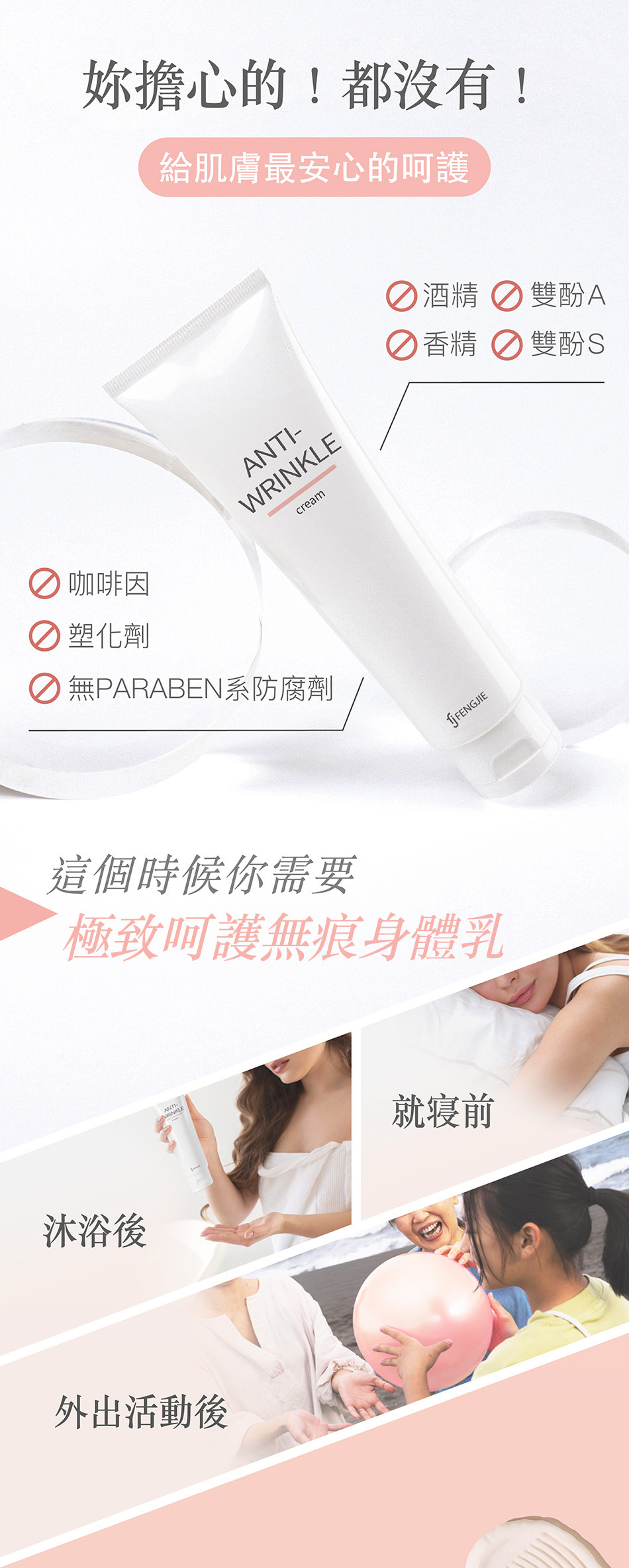 日常生活中衣服穿脫、頻繁的磨擦,都會讓手肘、膝蓋等關節處的肌膚容易乾燥、產生暗沉,摸起來甚至會有乾燥粗糙的觸感。除了這些角質比較厚的部位,頸後及屁股也很容易因為摩擦等因素產生暗沉、細紋。推薦使用具有保濕鎖水的撫紋霜去加強保養。
