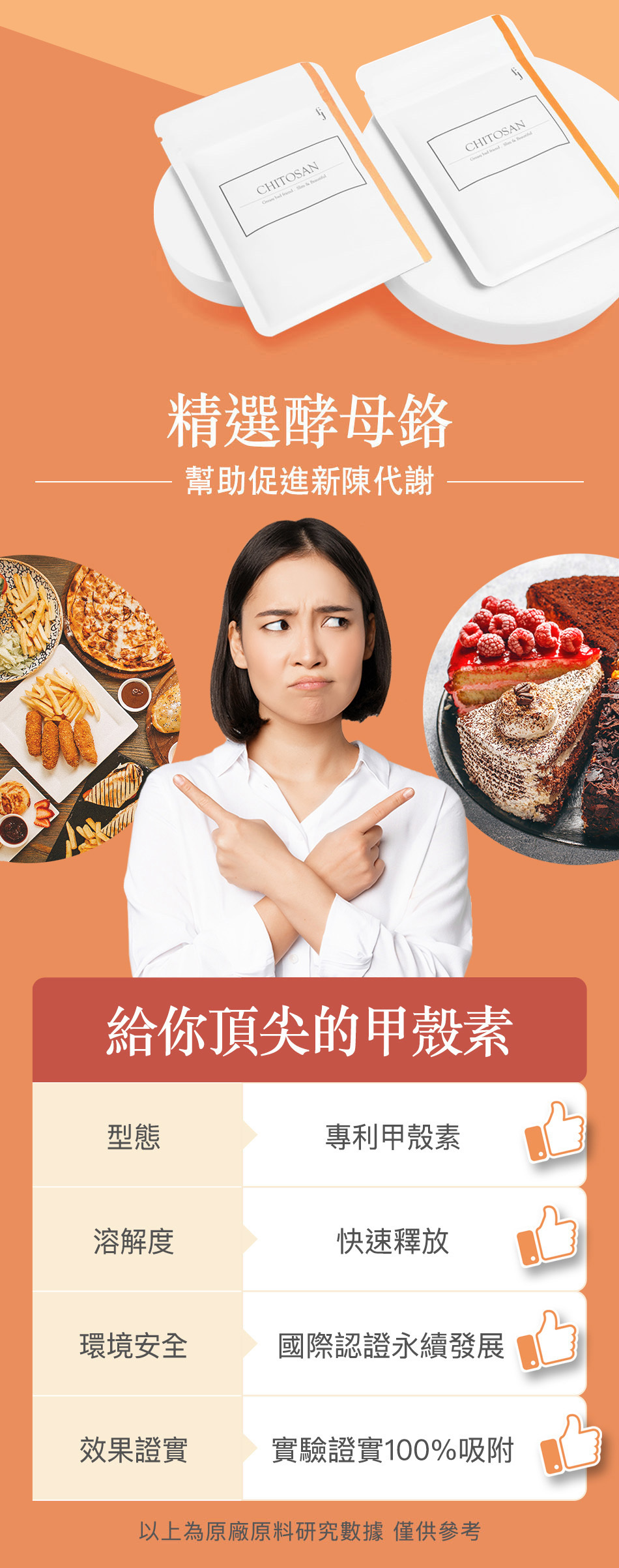 甲殼素,是自然界節肢動物的外骨骼,也是多醣分子的膳食纖維種類,多用於醫學等領域。對於愛吃大餐、高熱量密度食物的人,攝取甲殼素可以促進新陳代謝,幫助窈窕美麗。