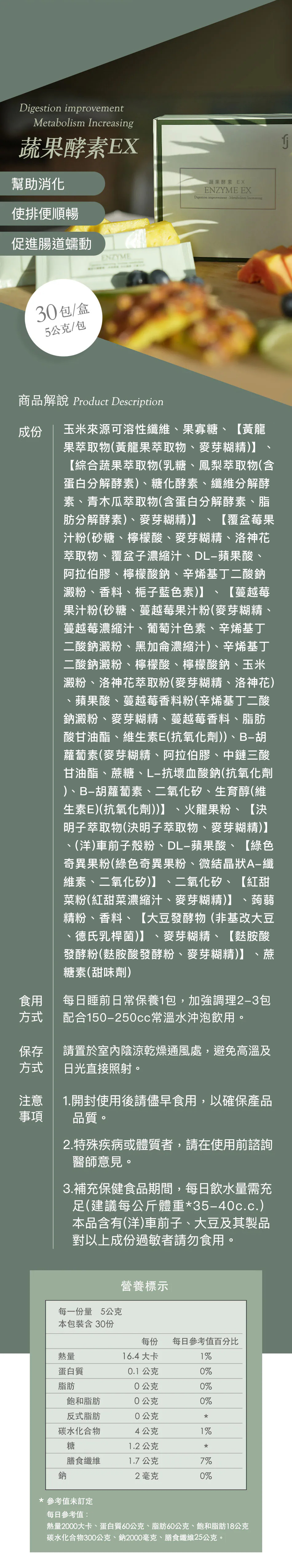 在過去兩年間,我們不斷優化舊版酵素配方,除了提升蔬果的豐富度,還增加了膳食纖維含量,達成了黃金比例的雙效膳食纖維配方。為了提供顧客更大的安心保障,進行了酵素活性與膳食纖維含量檢測。結果顯示,酵素活性不僅高於原料數據,每包酵素更含有「高達33%的膳食纖維」,促進腸道蠕動、幫助排便順暢。最重要的是,我們的蔬果酵素EX不含任何瀉藥成分,不同於市面上許多含有瀉藥成分的酵素,讓你享受純淨的配方,食用更安心。此外,還特別委託專業機構,進行菌相實驗,並且通過SNQ國家品質標章認證,讓產品的有感度與安心度更加卓越。