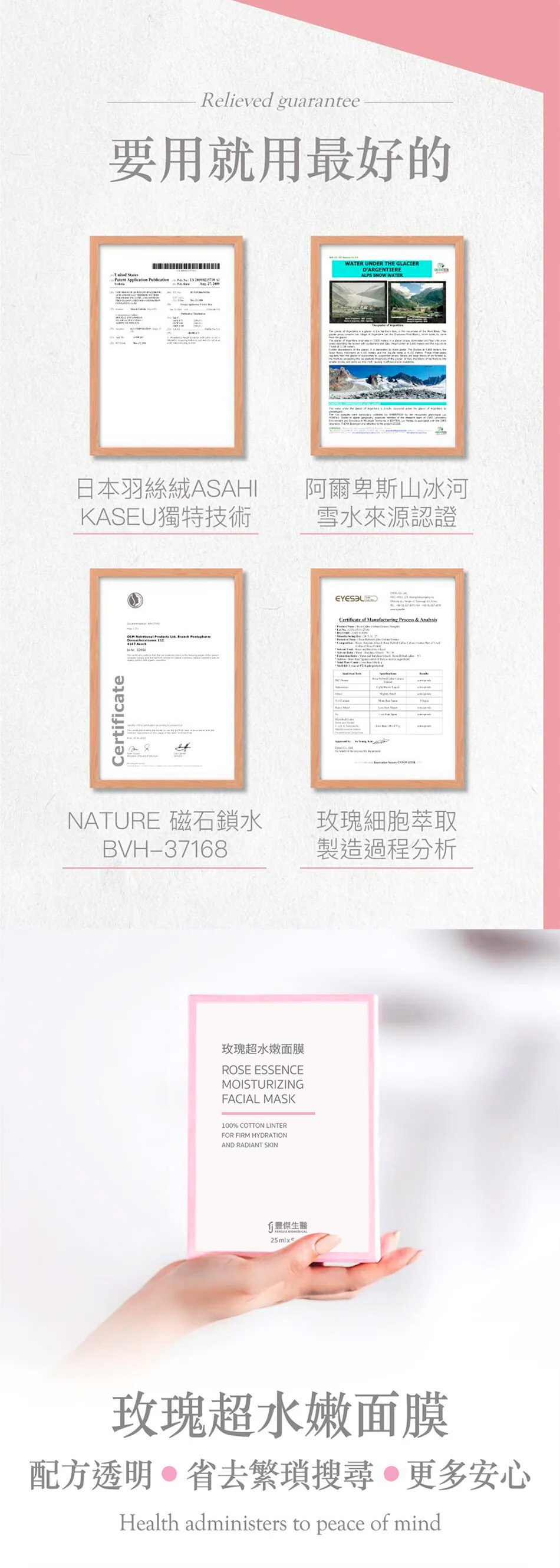 不計成本採用日本製的羽絲縷質料:100%棉籽絨只取10%的精華纖維,敷在臉上幾乎感覺不到存在,細長的纖維更有彈力與韌性,照顧到肌膚各個角落,因特殊織法特性,能與肌膚完全貼合。