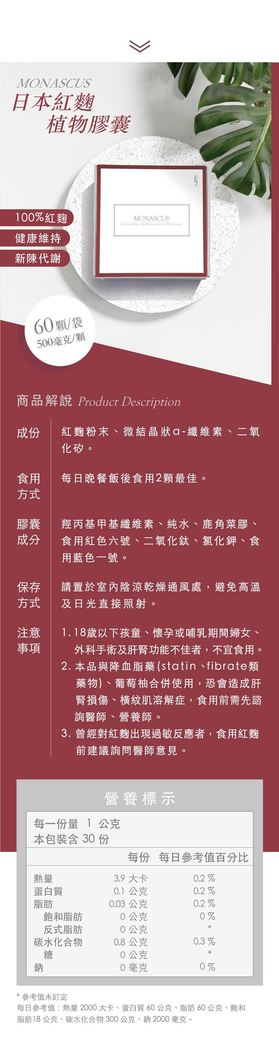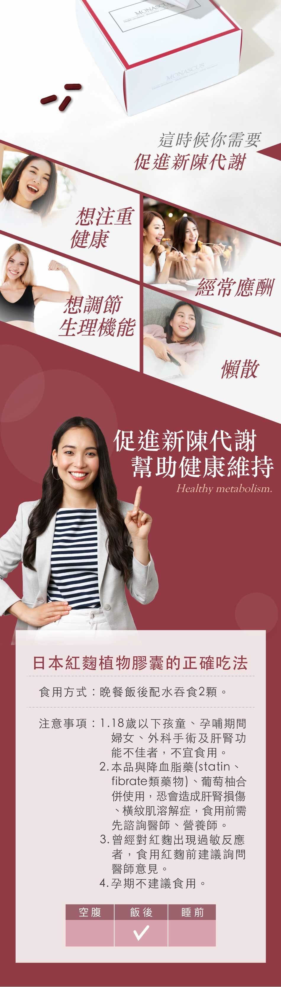 衛福部建議:「每日攝取量所含之 monacolin K 至少應達4.8毫克。」本產品每日食用2顆,為衛福部建議基礎量的3倍含量,幫助促進新陳代謝。
